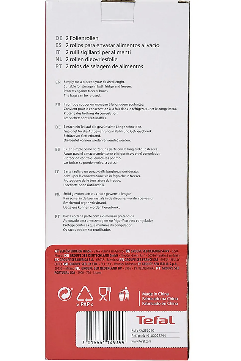 2 rouleaux pour emballage sous vide Tefal – Lot de 2 rouleaux de sacs pour appareil à emballage sous vide Tefal XA256010. Il suffit de couper un morceau à la longueur souhaitée. Convient pour la conservation à la fois dans le réfrigérateur et le congélateur. Protège des brûlures de congélation. Les sachets sont réutilisables. Ces sacs/rouleaux peuvent être utilisés avec les emballeuses sous-vide Vacupack. – Type de produit : Sac sous-vide.Modèle de compatibilité : Vacupack VT254070 / VT256070.Coloris : Transparent.Conditionnement : 2.Dimensions rouleaux : 22 cm x 3 m et 28 cm x 3 m.Poids : 0.406 Kg.