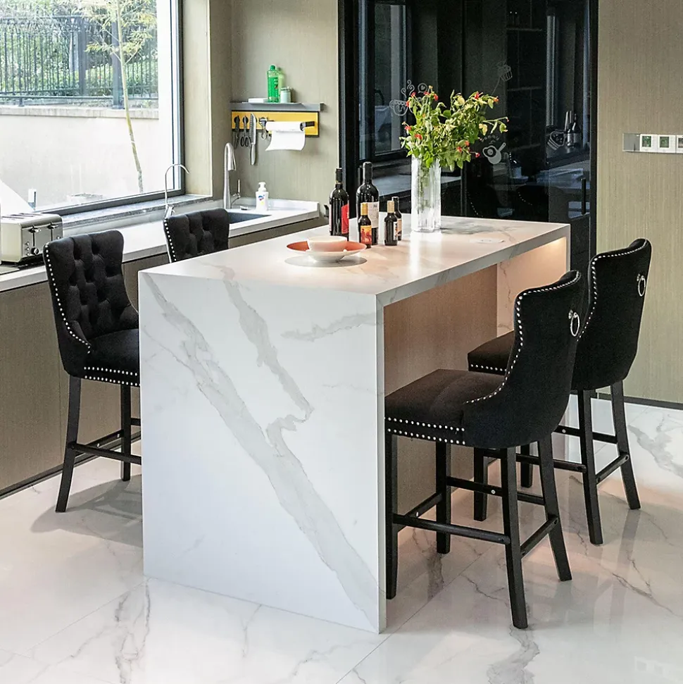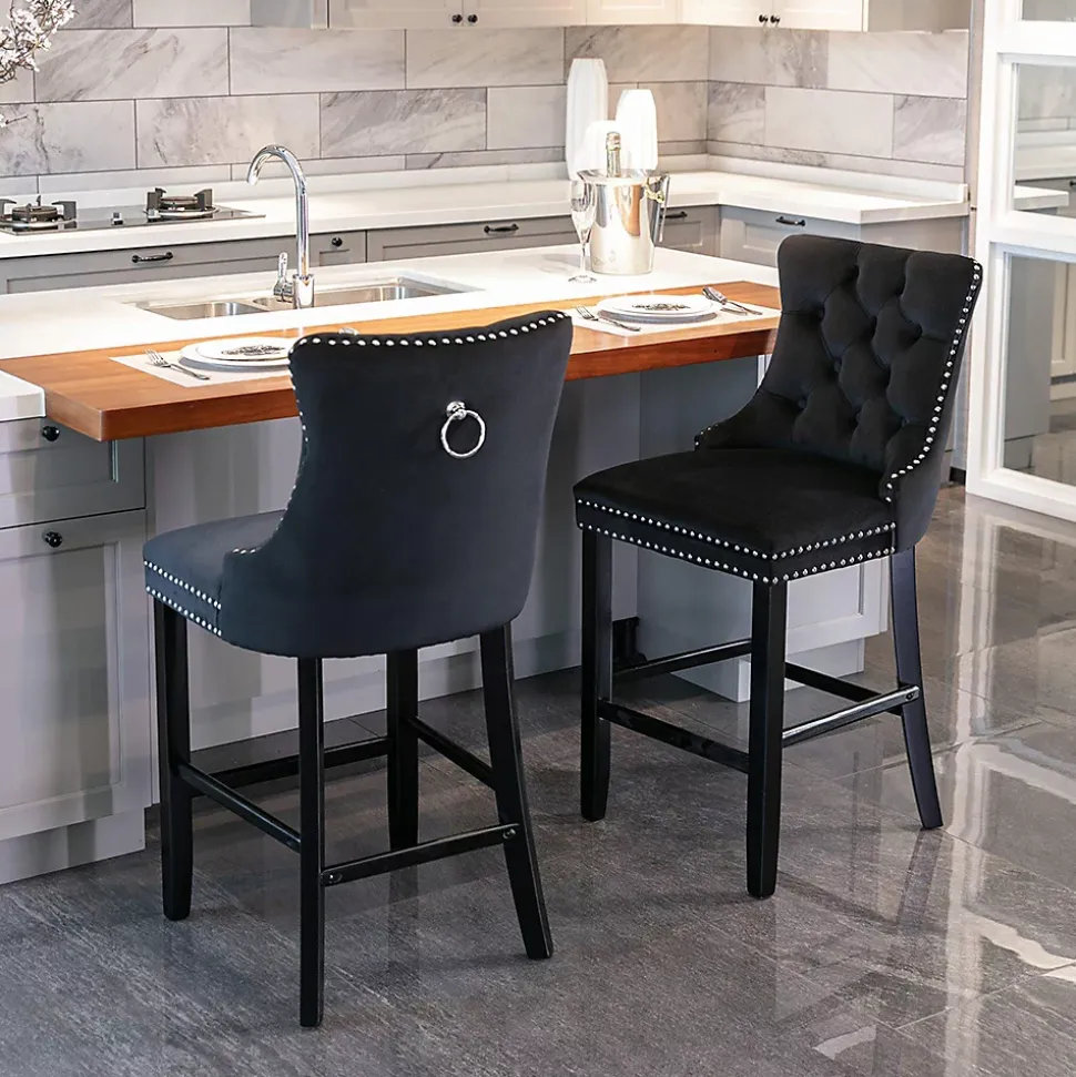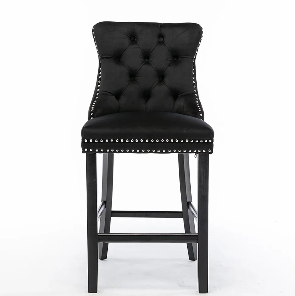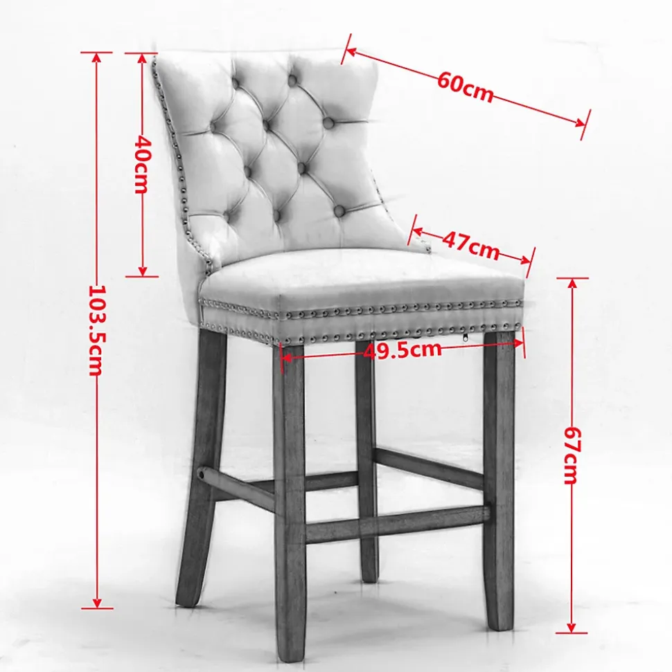 - Cet ensemble de tabourets de bar présente un design à dossier haut offrant un soutien lombaire robuste et confortable. Des rivets décoratifs ornent les coussins et le dossier, conférant une élégance noble tout en apportant une texture raffinée et luxueuse à l’ensemble.