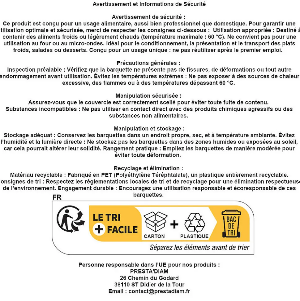 - ✅ PLASTIQUE PET RECYCLABLE : Matériau transparent, rigide et apte au contact alimentaire – Température maximale de 60 °C