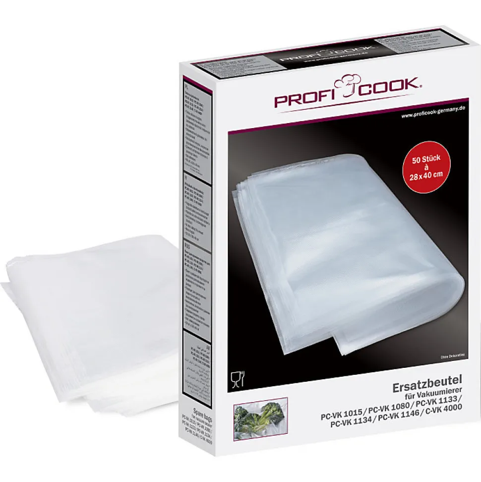Lot de 50 sacs sous vide Profi Cook 28 x 40 cm – conserve jusqu’à 8x plus longtemps, protège vitamines et arômes, matériau renforcé avec structure diagonale, réutilisables et compatibles micro-ondes, cuisson sous vide et congélation.