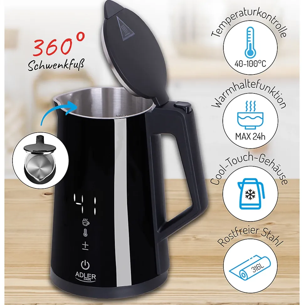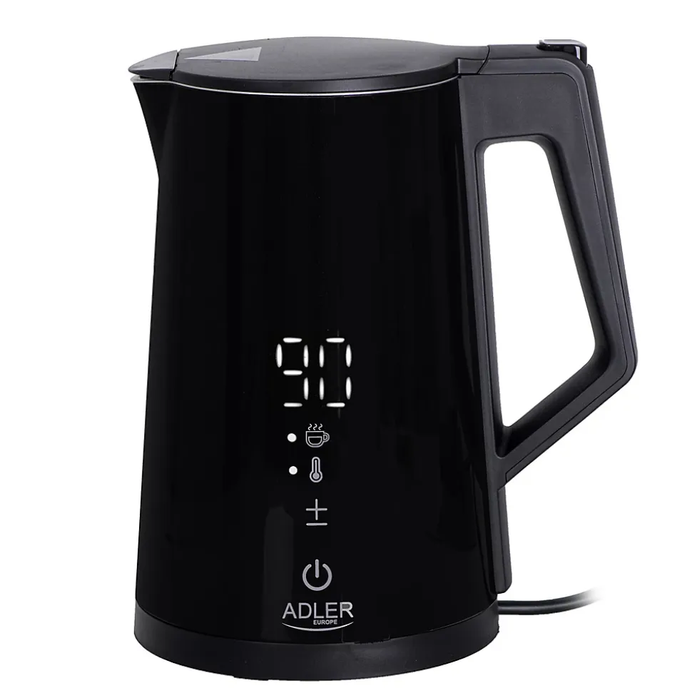 La bouilloire électrique est aujourd’hui présente dans la plupart des cuisines. Grâce à ses nombreuses fonctions, à ses designs et à son design originaux, vous pouvez l’adapter à vos goûts et à l’aménagement de votre pièce. Cette bouilloire moderne de 1,7 litre est fabriquée en STRIX. Sa sécurité est assurée par un verrouillage empêchant la mise en marche à vide, un arrêt automatique après ébullition et le système de contrôle de sécurité STRIX. Sa base stable et son écran LED lisible renforcent sa fonctionnalité. D’une puissance maximale de 2200 W, elle est dotée d’un boîtier à double paroi, ce qui en fait un appareil idéal pour faire bouillir rapidement de l’eau. La température de cuisson est réglable à 40 °C / 55 °C / 80 °C / 90 °C / 100 °C. Le système de contrôle de sécurité STRIX, le boîtier non chauffant et l’écran tactile LED distinguent cet appareil des autres modèles du marché.- Bouilloire électrique avec affichage LED et régulation de la température- Système de contrôle de sécurité STRIX- Boîtier froid au toucher- Capacité max : 1,7 L- Capacité min : 0,5 L- Élément chauffant plat en acier inoxydable de haute qualité- Boîtier à double paroi- Écran tactile- Protection automatique contre l’ébullition sans eau- Affichage LED indiquant la température actuelle- Bip au démarrage et après avoir fait bouillir de l’eau- Température de cuisson réglable 40°C / 55°C / 80°C / 90°C / 100°C- Fonction maintien au chaud 40°C / 55°C / 80°C / 90°C- Fonction de maintien au chaud jusqu’à 24 heures maximum- Indicateur de niveau d’eau interne- Arrêt automatique- Base pivotante à 360°- Rangement du cordon- Alimentation : 220-240V ~50/60Hz- Longueur du cordon d’alimentation : 75 cm- Puissance nominale : 1850 W- Puissance max. 2200W- Dimensions du produit : 26,0 x 22,0 x 16,0 cm- Poids : 1.25 Kg- Couleur : noir- Ty…