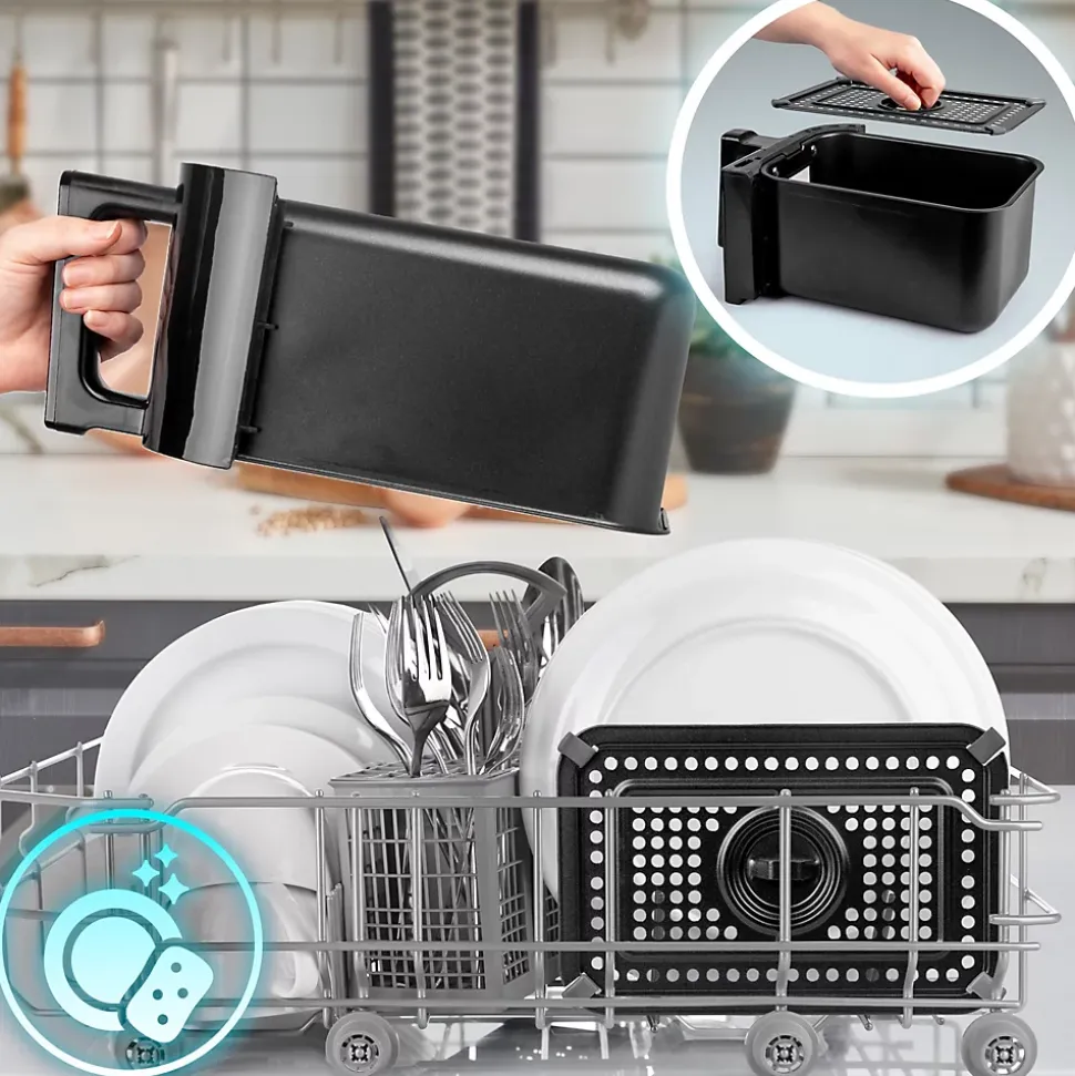 La friteuse à air AF24 de Duronic vous permet de faire frire ou de cuire rapidement vos aliments tels que des frites, du poulet, des légumes, du poisson. Plus rapide et moins énergivore qu’un four, cette friteuse à air qui ne nécessite pas ou très peu d’huile permet également une cuisson plus saine des aliments.L’AF24 possède deux compartiments de cuisson de 5 litres chacun. Vous pouvez donc cuire votre poulet et vos frites en même temps. La fenêtre transparente de chaque compartiment ainsi que les lumières intégrées vous permettent de surveiller la cuisson de vos aliments sans avoir à ouvrir les tiroirs.Dans chacun des compartiment, vous pouvez cuire vos aliments pour plusieurs personnes. Dans l’un vous pouvez par exemple cuire votre viande et dans l’autre, vos frites. Un tiroir de 10 litres, l’AFD1, vendu séparément, est également disponible pour remplacer les deux tiroirs de 5 litres.Cette friteuse à air peut être programmée pour utiliser les 10 modes de cuisson préréglés. Vous pouvez par exemple réchauffer des aliments froids, faire cuire des frites, du poulet, ou des gâteaux, ou encore déshydrater des fruits. L’AF24 a également deux fonctions : la fonction Sync Cook qui vous permet de faire correspondre le même réglage aux deux tiroirs et la fonction Sync Finish qui vous permet de cuisiner sur deux réglages programmés pour que les deux se terminent en même temps.Puissance: 2400W. Capacité totale: 10 litres (2×5 litres). Couleur: noir. Températures de cuisson: 50°C min. et 200°C max. Dimensions: 39 x 37.7 x 32.5 cm. Dimensions du tiroir: 22.5 x 14.5 x 11 cm. Longueur du câble: 105 cm.