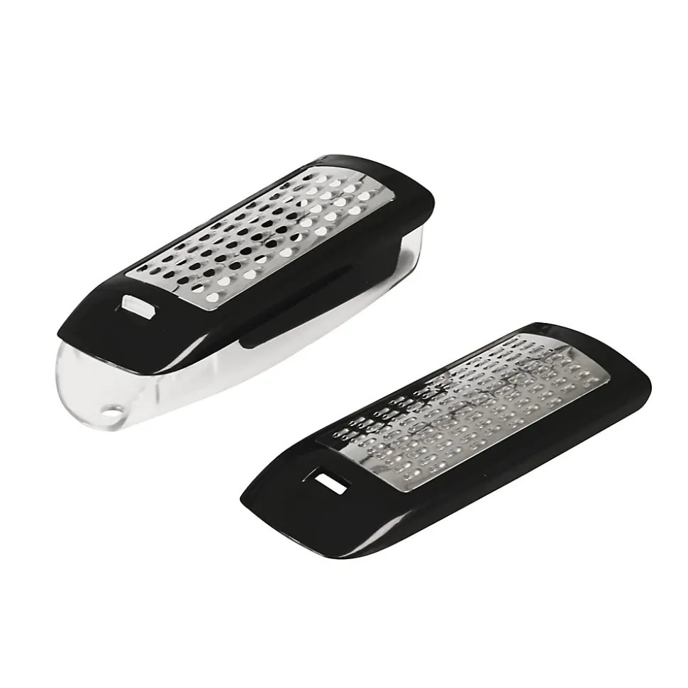 Râpe avec corps et récipient en ABS. Avec deux lames interchangeables en acier inoxydable. Pour râper fin et grossier.