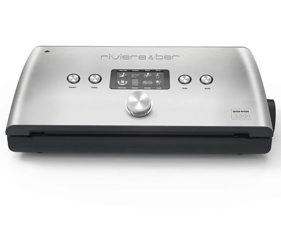 Appareil à emballage sous vide 125w Riviera & Bar – L’appareil à emballage sous vide Riviera & Bar PSV760 avec dateur intégré associe polyvalence et performances.Super pratique pour se rappeler du contenu des sachets mis sous-vide, l?appareil PSV 760 est équipé d?un dateur qui permet de graver la date de mise sous-vide et d?indiquer par une initiale le type d?aliments directement pendant la soudure (système d?autant plus ingénieux qu?il n?utilise pas d?encre?).Avec sa fonction Ballon, chips, gâteaux et autres délices fragiles ne finiront plus à plat ! Car la fonction Ballon vient souffler de l?air dans le sachet et le ferme ensuite par thermo-soudure. Les aliments délicats sont ainsi protégés de l?humidité et des odeurs pendant le stockage comme le transport !L?écran LCD invite à choisir entre les 5 programmes conçus pour une grande variété de préparations? Si les programmes Sous Vide et Soudure sont des fonctions usuelles de cette typologie de produits, les programmes Ballon, Bocal et Marinade élargissent les usages?Il propose 2 niveaux de scellement pour les aliments secs ou humides , 4 vitesses d?aspiration de l?air fonction du type d?aliments dont un mode Pulse manuel (idéal si on souhaite contrôler soi-même l?aspiration de l?air sans utiliser l?un des programmes pré-enregistrés) et un mode Favori pour enregistrer son programme le plus fréquemment utilisé.Il se distingue jusque dans les détails? L?écran LCD et sa molette Easy Select le rendent très intuitif d?utilisation. Esthétique avec sa finition Inox brossé, il intègre également un revêtement anti-trace. Il se verrouille d?une seule main. Le cutter intégré permet de préparer le sachet à la longueur souhaitée.Il est fourni avec de nombreux accessoires additionnels : 1 rouleau de 28 cm x 3 mètres , 10 sacs gaufrés extra-épais (5 sachets de 20 x 29 cm et 5 sachets de 28 x 37 cm) , 1 bouchon sous-vide avec son tuyau d?aspiration pour bouteille de 75 cl et boissons non pétillantes.Entre polyvalence et