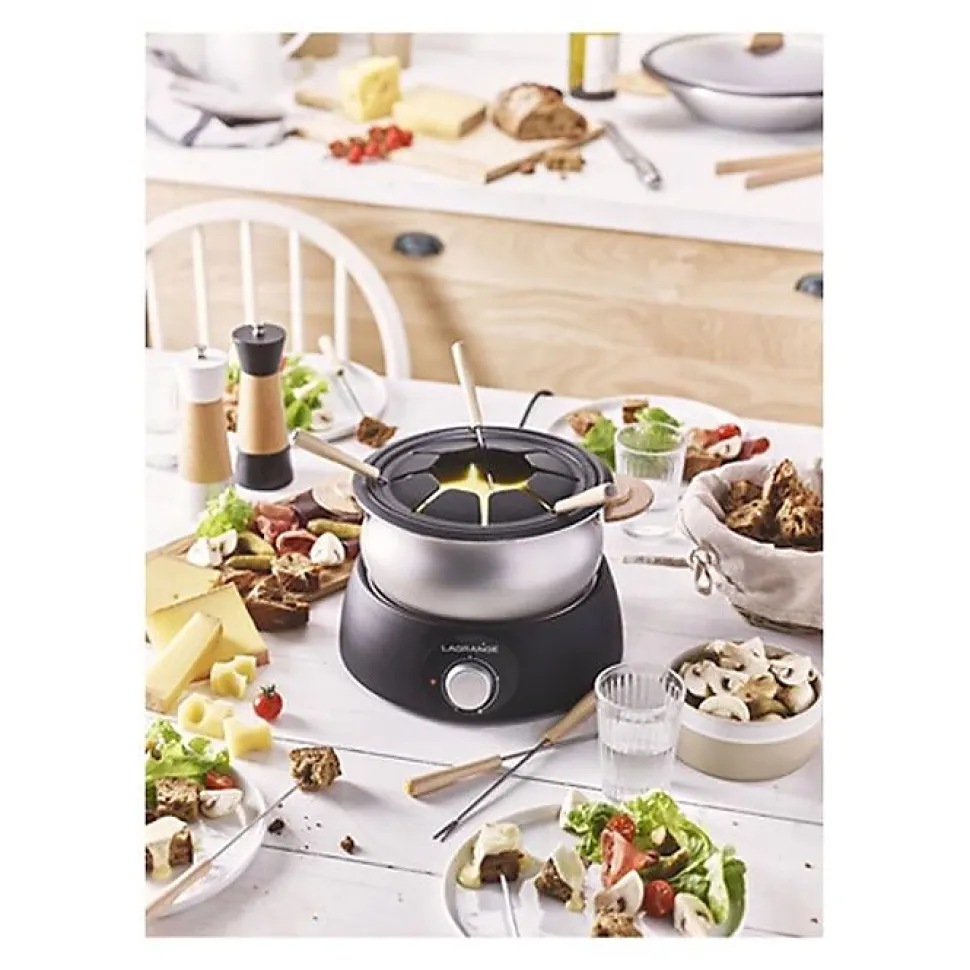 - Accessoires inclus : caquelon fondue, wok, couvercle en verre avec bouton en bois, grille garde au chaud, spatule, pince-aliments en bois, 8 fourchettes avec manche en bois.