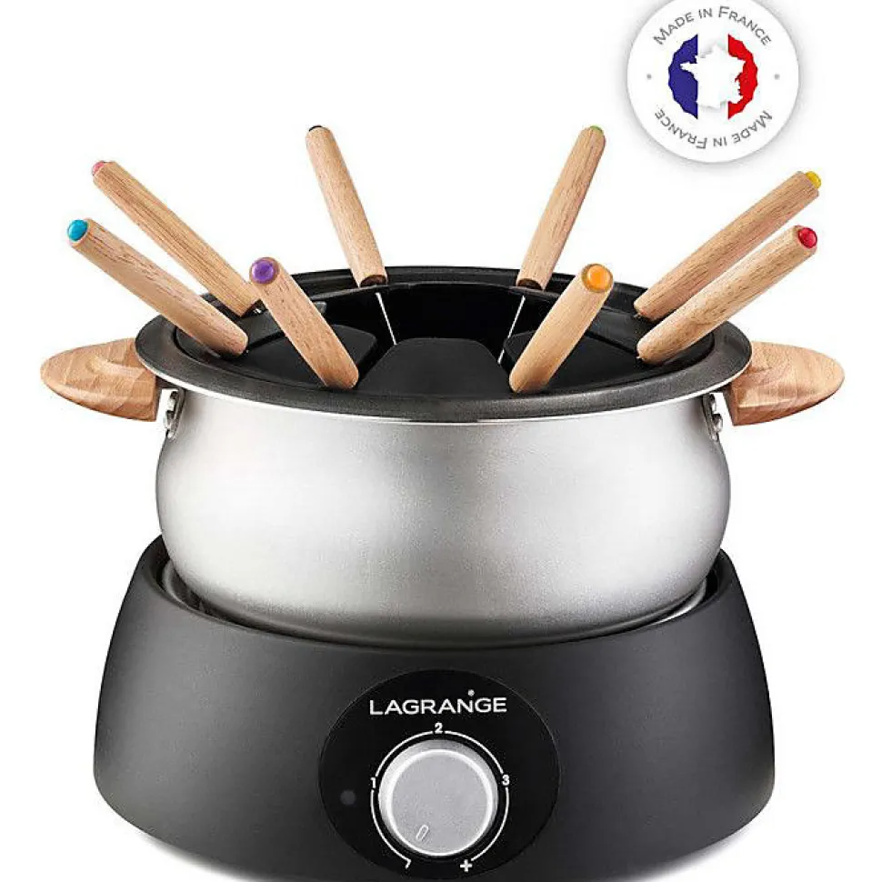 Appareil à fondue Lagrange Classic pour 8 personnes, équipé d’un thermostat réglable, caquelon antiadhésif 1,5L, 8 fourchettes avec manches en bois. Design chaleureux en bois clair et socle en thermoplastique. Puissance 900 W pour un usage convivial et efficace. Fabriqué en France.