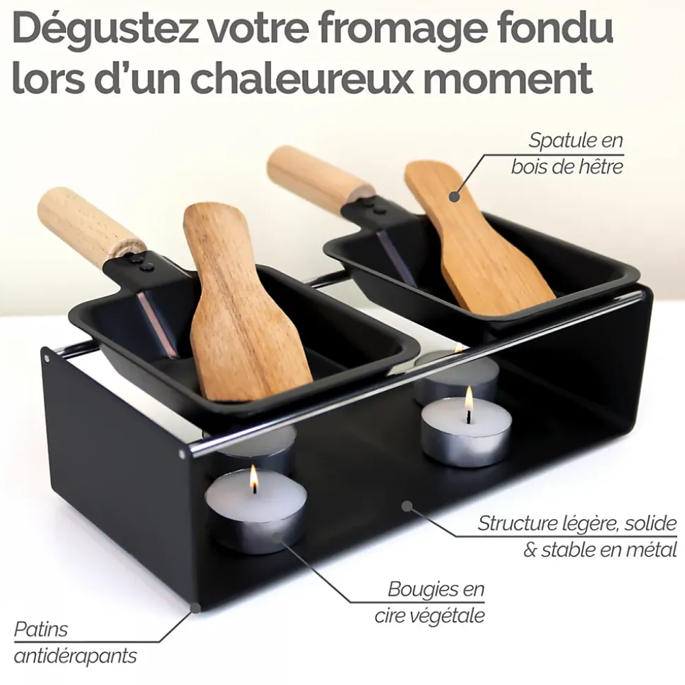Ce kit de raclette à la bougie, de la marque Linxor, est destiné à une utilisation en duo. Il vous accompagnera pour déguster votre fromage fondu lors d’un savoureux et chaleureux moment à partager.Très pratique et peu encombrant, il est facile à utiliser. Vous pouvez transporter votre raclette partout avec vous. Il vous suffit d’installer vos quatre bougies (incluses, deux par personne) sur la plateforme du bas, de positionner le poêlon sur le dessus et enfin, d’attendre quelques minutes selon vos préférences de cuisson.Fabriquée en métal fer, la structure de votre raclette est légère, solide et stable avec ses patins antidérapants. Deux spatules en bois de hêtre accompagneront votre dégustation afin de ne pas abimer les poêlons. Enfin, les bougies sont en cire végétale.Pour un moment gourmand, le socle accueillant les bougies mesure 23 x 10 x 6.5 cm. Le poêlon, quant à lui, mesure 19.6 x 9.3 cm et la spatule 13.4 x 4 cm. Ce délicieux kit est également disponible pour 2 personnes.Notre ambition est de répondre à vos besoins du quotidien en vous proposant des gammes de plus en plus variées et tendance. Un large éventail de produits est à retrouver à travers nos différentes marques.