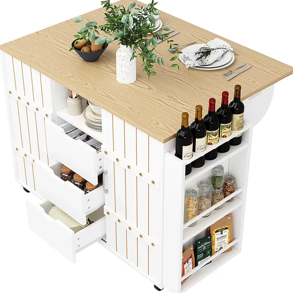 SpécificationsCouleur principale : BlancMatériau principal : MDFDimensions du produitLongueur assemblé (cm) : 110,00Largeur assemblé (cm) : 42,00Hauteur assemblé (cm) : 90,00Poids du produit (kg) : 46,75Dimensions du colisSous-article 1 : 95,25 * 45,09 * 18,42 cm 24 kgSous-article 2 : 125,1 * 49,53 * 13,97 cm 26,75 kgCaractéristiques du produitDimensions du produit : îlot de cuisine longueur 110 cm, largeur 42 cm, hauteur 90 cm. Ce chariot de cuisine dispose d’un plateau rabattable qui peut être utilisé comme table à manger lorsqu’il est déplié et qui mesure 70 cm de long une fois déplié.Conception détaillée : matériaux de haute qualité et design raffiné. Le plateau en bois MDF haute densité présente une structure naturelle et durable ; avec ses poignées en aluminium et son design élégant en 3D, il est à la fois esthétique et pratique et s’intègre facilement dans un style de vie moderne.Espace de rangement polyvalent : avec trois tiroirs, une étagère latérale, un porte-serviettes et des étagères réglables, vous pouvez facilement ranger vos couverts, épices, bouteilles de vin, boissons et autres ustensiles de cuisine.