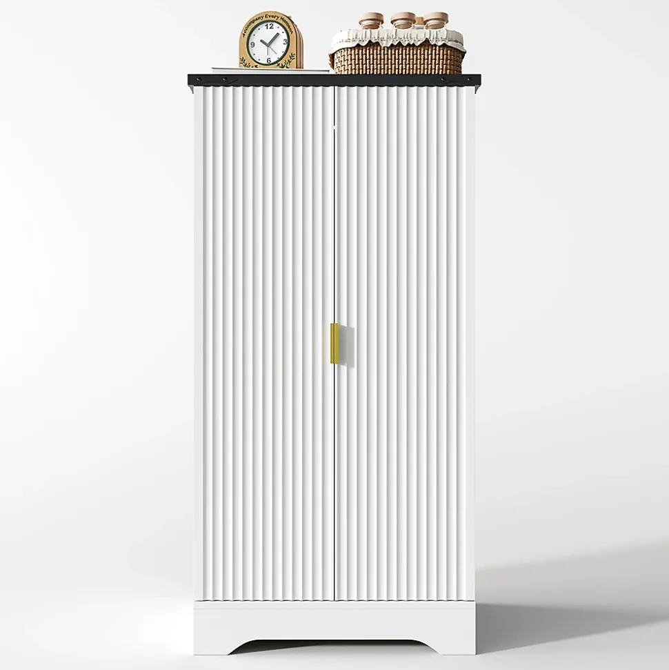 - Armoire haute moderne et minimaliste : construction en MDF de haute qualité avec portes rainurées et poignées dorées. S’adapte à différents styles d’intérieur.