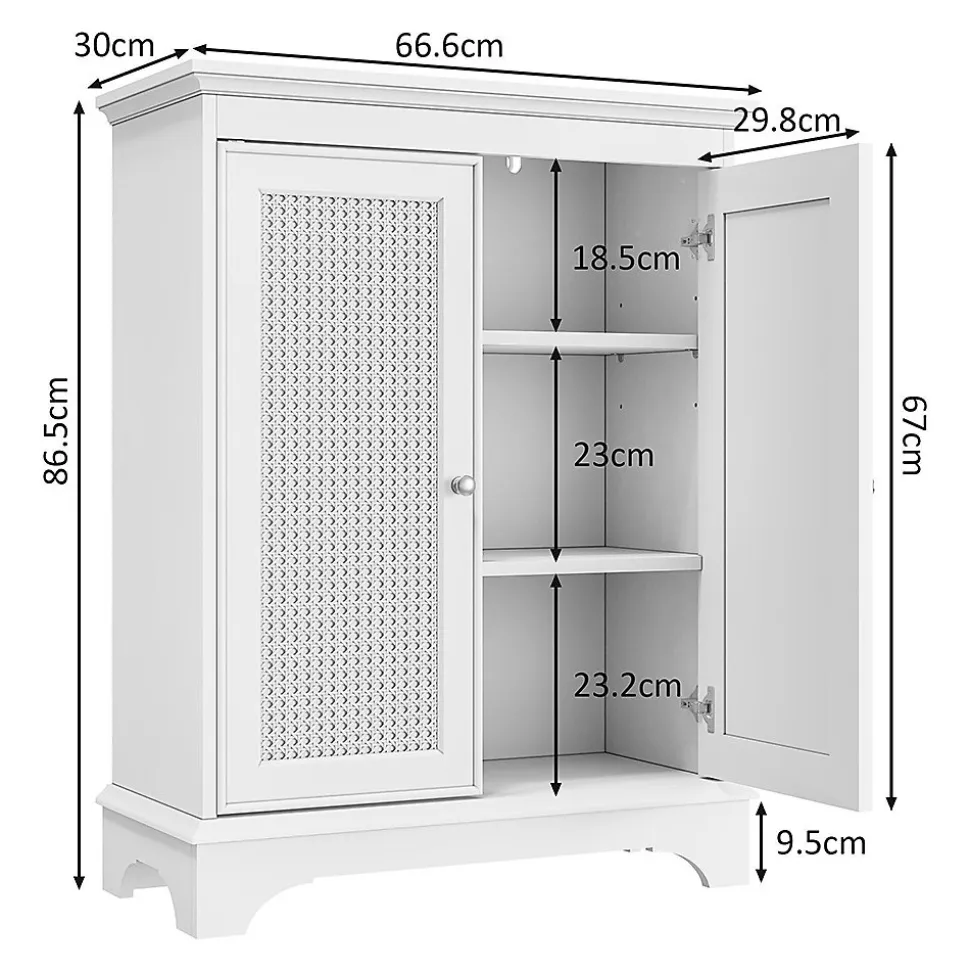 Caractéristiques du produitDimensions du produitLongueur assemblé (cm) : 66,60Largeur assemblé (cm) : 29,80Hauteur assemblé (cm) : 86,50Poids du produit (kg) : 16,45Dimensions de l’emballageLongueur (cm) : 85,50Largeur (cm) : 35,80Hauteur (cm) : 18,50Poids (kg) : 17,70Informations sur le produitLieu d’origine : ChineCouleur principale : BlancMatériau principal : MDFRemplissage : MDFStyle du produit : Art déco, bohème, moderne du milieu du siècle, mix and match, moderneCas d’utilisation : Salle de bain