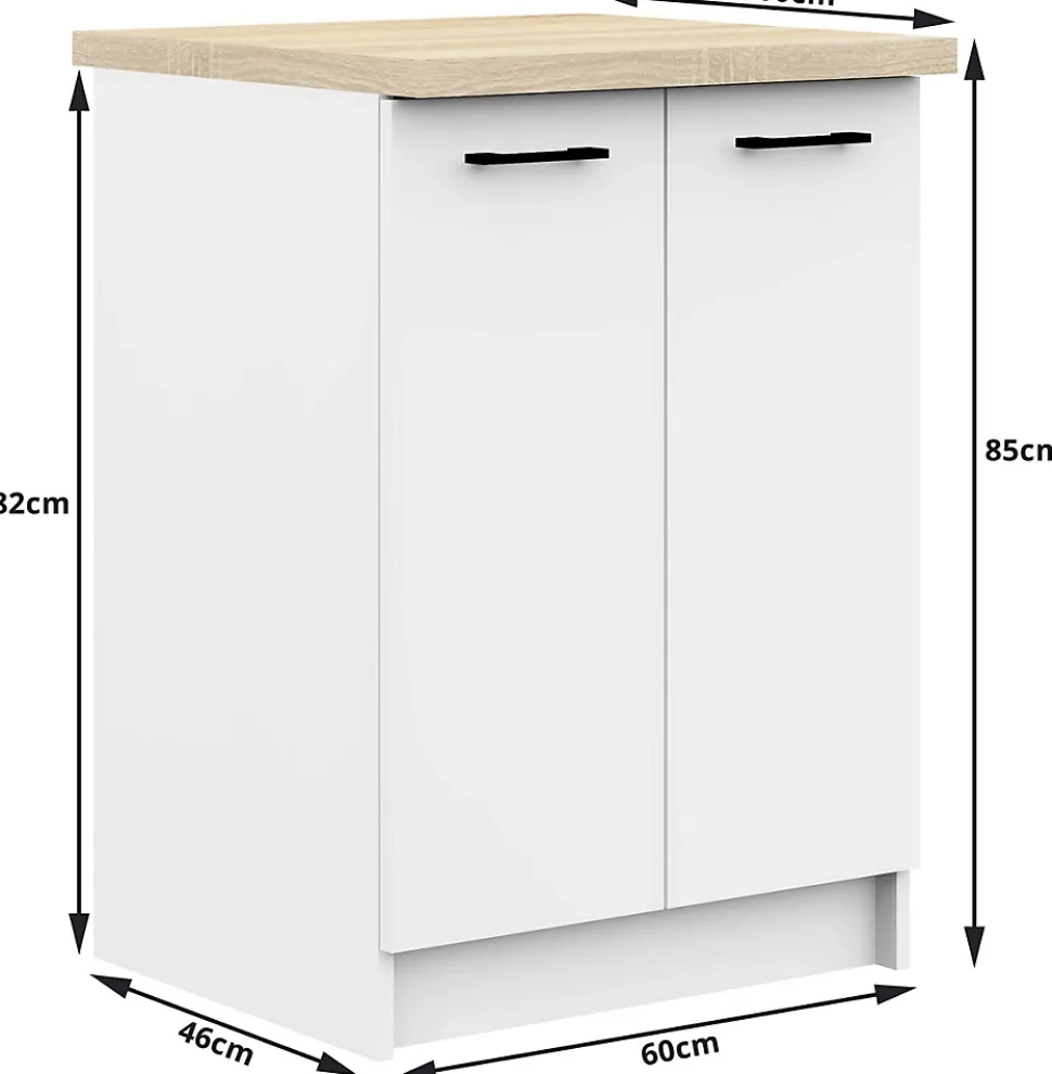 Armoires de cuisine basse AKORD S60 OLIWIA modulable Blanc 60 cm 2 portes façade Blanche 2 étagères 60x46x85 cmLe Armoires de cuisine basse avec plan de travail OLIWIA est une proposition pour les personnes qui souhaitent aménager leur cuisine de manière intemporelle et universelle. Le meuble est destiné aux cuisines modulaires, il se caractérise avant tout par un design moderne, mais aussi par une excellente qualité. Le meuble permet de ranger les couverts, vaisselle, nourriture, produits de nettoyage et autres produits nécessaires dans chaque cuisine. Les armoires que nous proposons sont une combinaison de valeurs visuelles, de performances durables et de fonctionnalité. Les poignées lumineuses permettent une ouverture et une fermeture faciles de l’armoire. Le prix avantageux est également remarquable, ce qui rend les propositions de la collection OLIWIA très populaires. Dimensions: Largeur: 60 cmProfondeur: 46 cmSpécification:Matériau: panneau laminé de l’entreprise KronospanEacute;paisseur du panneau: 16 mmQualité du panneau: Certificat E1 *Bordure: ABS 0,5 mmColour:Caisson : BlancFaçades : BlancNombre d’étagères: 2Nombre de portes: 2* Certificat E1, classe d’hygiène E1