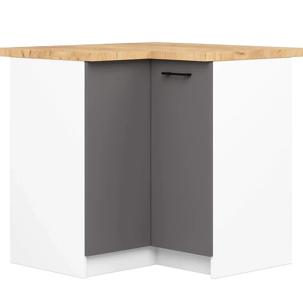 Meuble de cuisine bas AKORD S90 d’angle avec plan de travail OLIWIA Blanc 90 cm 2 portes façade Gris Graphite 2 étagères 90x46x85 cmLa cuisine est la pièce maîtresse de chaque foyer. C’est là que les membres du foyer préparent chaque jour de nombreux repas, discutent et passent du temps ensemble. Il n’est donc pas surprenant que chacun veuille aménager sa cuisine de manière à la fois fonctionnelle et agréable à l’œil. Les meubles de la collection Oliwia y contribueront certainement. Nous aimerions vous présenter l’un des éléments de cet ensemble modulaire – le meuble d’angle S90/90N, conçu dans la couleur blanche à la mode, qui contraste parfaitement avec les poignées noires mates, créant ainsi un ensemble unique. Cet élégant meuble permet d’ouvrir les portes à droite et à gauche, afin d’accéder librement à un grand espace, dans lequel il est possible de placer de nombreux articles nécessaires dans chaque cuisine, des produits d’entretien ou des denrées alimentaires.Le meuble dispose en outre de deux plateaux combinés 30/60 et 84/60 qui forment une unité pour le meuble d’angle.Dimensions: Largeur: 90 cmProfondeur: 46 cmSpécification:Matériau: panneau laminé de l’entreprise KronospanEacute;paisseur du panneau: 16 mmQualité du panneau: Certificat E1 *Bordure: ABS 0,5 mmColour:Caisson : BlancFaçades : Gris GraphiteNombre d’étagères: 2Nombre de portes: 2* Certificat E1, classe d’hygiène E1