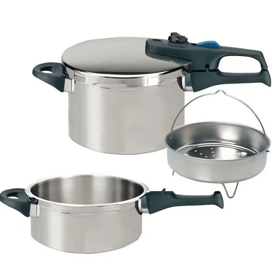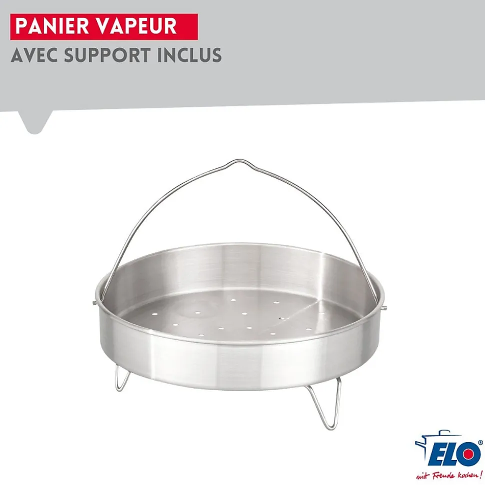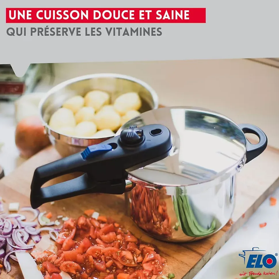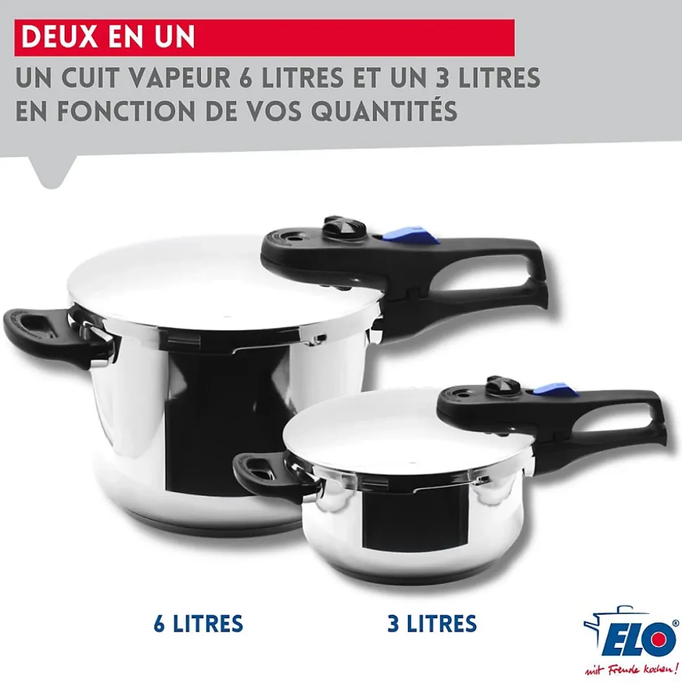 - DESCRIPTION : Autocuiseur vapeur ELO Praktika Plus XL 22 cm deux en un, en acier inoxydable 18/10, 3L et 6L, tous types de feux dont induction