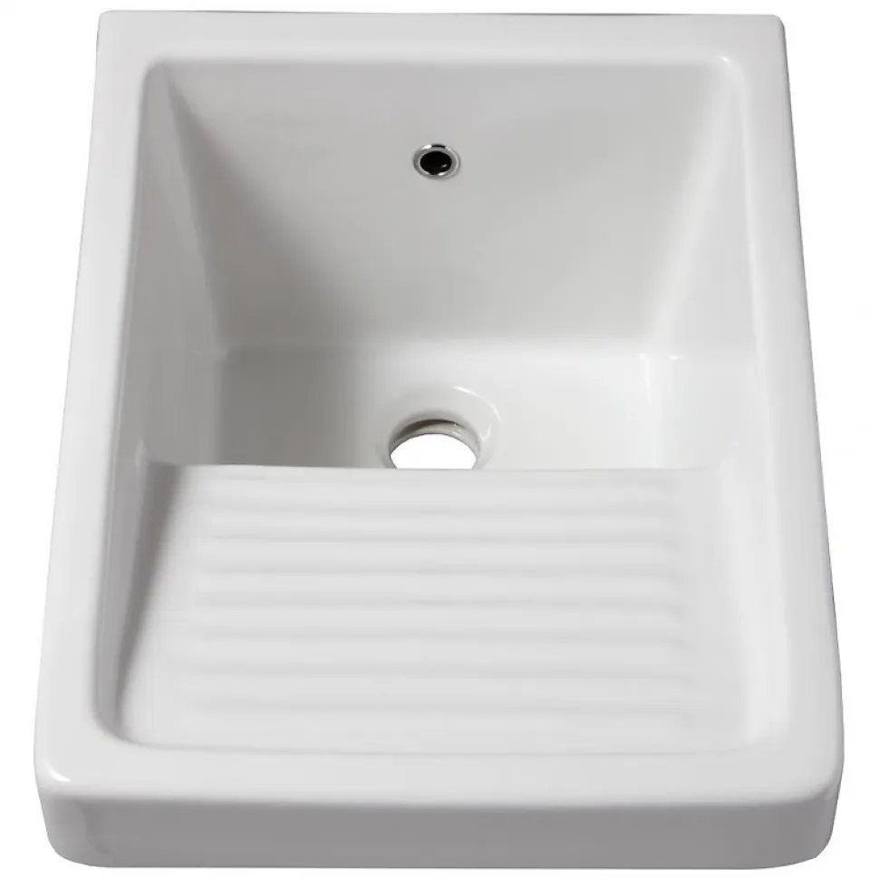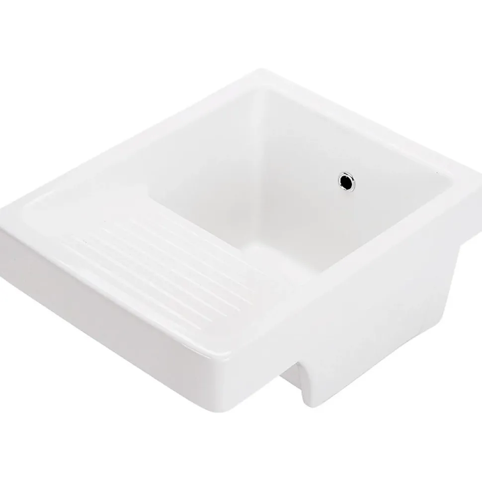 Bac à laver carré en céramique blanche. BAC À LAVER Le bac à laver dispose d’un égouttoir.Il dispose d’un trop plein dans la céramique (sans cache chromé).A l’inverse, il ne dispose pas de plage de robinetterie.Il n’est pas émaillé à l’arrière et partiellement sur l’avant. Préconisations Il est conseillé de poser le bac à laver sur un meuble ou de le suspendre.Note Il est possible de suspendre le bac mais cela nécessite un kit de fixation de lavabo spécifique de type attache (pas de trou de fixations permettant l’usage de tiges filetées).L’article est vendu sans kit de fixation. Le bac à laver est vendu sans accessoires (bonde, siphon et kit de fixation).