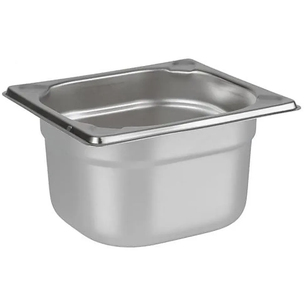 Bac Inox GN 1/6 176 x 162 x 100 mm Bac gastronorme en acier inoxydable au chrome-nickel avec surface polie par électrolyse (mate satinée), lavable au lave-vaisselle, empilable.Capacité : 1,6 litre Bac gastro de qualité professionnelle idéale pour cantines, restaurants, hôtels, traiteurs, association, collectivité.