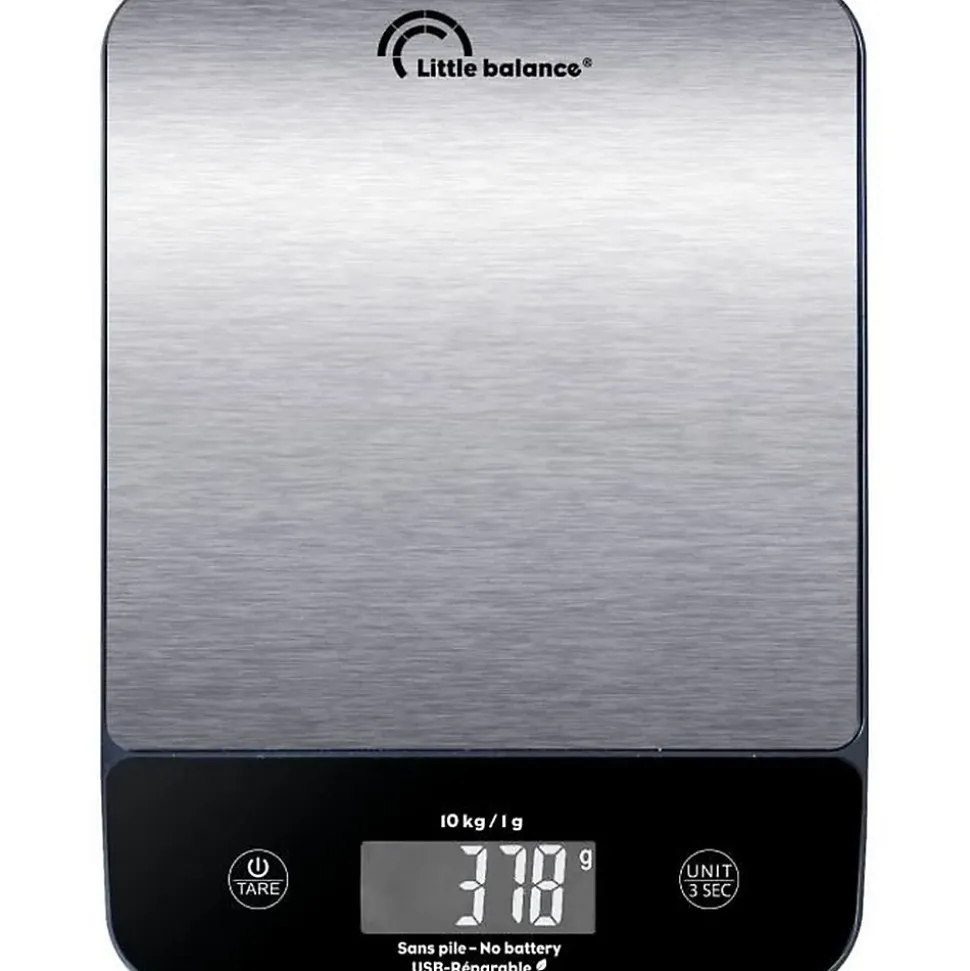 Conception et DesignLa balance de cuisine LITTLE BALANCE 8711 se distingue par son design unique et original, parfaitement adapté à tout décor de cuisine. Le plateau de pesée en inox mesure 180 x 180 mm, offrant une surface pratique pour peser des ingrédients dans de grands récipients. L’écran XXL rétroéclairé sur bandeau incliné anti-reflets permet une lecture facile et précise des poids.Caractéristiques TechniquesCette balance électronique possède une capacité de pesée maximale de 10 kg avec une graduation précise de 1 g. Elle permet le choix entre les unités de mesure en grammes et kilogrammes, ainsi qu’une fonction pour mesurer les liquides. L’alimentation est assurée par une recharge USB, offrant une autonomie de six mois environ après une charge de trois heures.Pratique et Économe en énergieLa balance est conçue pour être économe en énergie et durable. Elle fonctionne sans piles, ce qui réduit les déchets, et est réparable. Après des centaines de chargements, il est possible de remplacer la batterie soi-même, prolongeant ainsi la durée de vie du produit.Utilisation et AvantagesLa balance de cuisine LITTLE BALANCE 8711 est idéale pour les amateurs de cuisine comme pour les professionnels. Elle permet de mesurer avec précision les ingrédients, facilitant ainsi la préparation de recettes. Sa conception robuste et son plateau en inox facilitent le nettoyage et assurent une longue durée de vie.