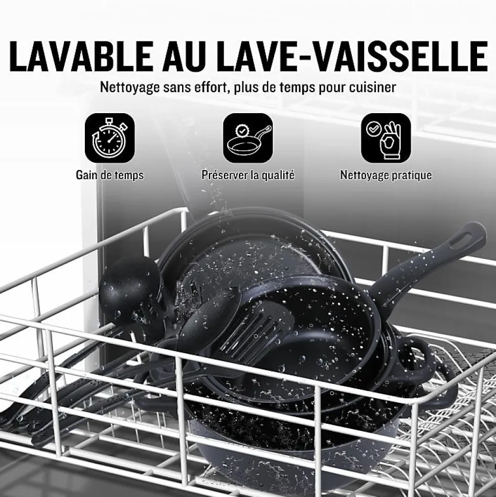 Améliorez votre expérience culinaire avec la batterie de cuisine antiadhésive Herzberg de 13 pièces, comprenant un ensemble de cuillères de cuisine en nylon, conçu pour les chefs débutants et chevronnés. Fabriquées en acier au carbone durable, ces casseroles et poêles conduisent la chaleur rapidement pour une cuisson précise, tandis que le revêtement antiadhésif assure un démoulage sans effort des aliments et un nettoyage facile, réduisant ainsi le besoin d’excès de graisses et d’huiles. L’ensemble comprend des pièces essentielles comme des marmites à soupe, des poêles à frire et des couvercles en verre avec évents de vapeur, offrant une polyvalence pour diverses tâches de cuisson et vous permettant de suivre facilement la progression de vos plats.Doté de poignées douces au toucher pour une manipulation confortable et compatible avec les cuisinières à gaz, électriques, à dessus en verre et à induction, cette batterie de cuisine offre commodité et flexibilité pour tous vos efforts culinaires. Les couvercles en verre trempé permettent une surveillance pratique de vos aliments pendant la cuisson, tandis que la conception lavable au lave-vaisselle garantit un nettoyage sans tracas. Avec sa finition résistante aux rayures et à l’usure, sa construction renforcée et sa finition peinte sûre, cette batterie de cuisine est conçue pour résister à une utilisation quotidienne et maintenir sa qualité au fil du temps. Que vous prépariez un repas rapide en semaine ou que vous prépariez un festin pour vos invités, la batterie de cuisine antiadhésive Herzberg est votre solution idéale pour une cuisine délicieuse et sans effort.Caractéristiques:Construction durable : la batterie de cuisine est fabriquée à partir de matériaux en acier inoxydable et en acier au carbone de haute qualité, garantissant longévité et résistance à la déformation ou à la déformation, même en cas d’utilisation fréquente.Construction à 6 couches :
