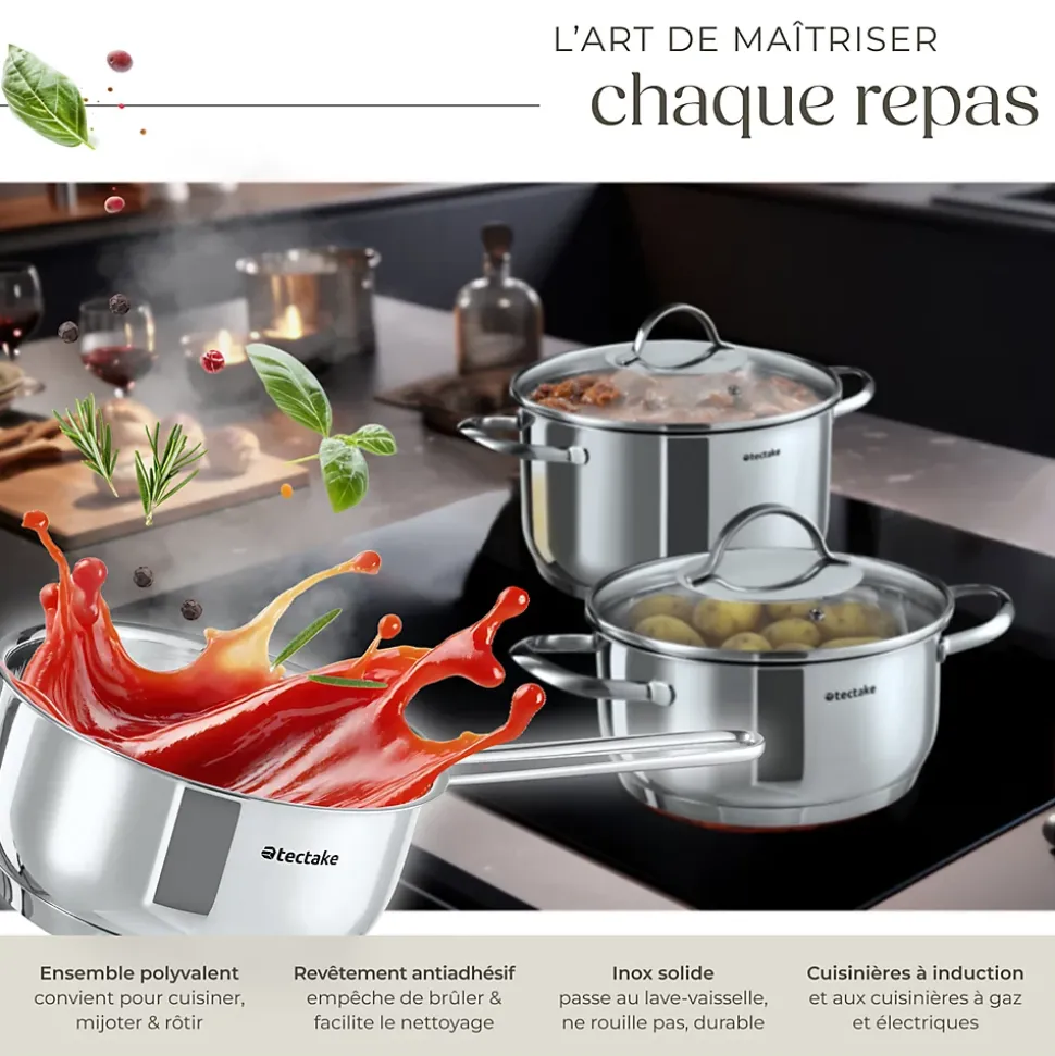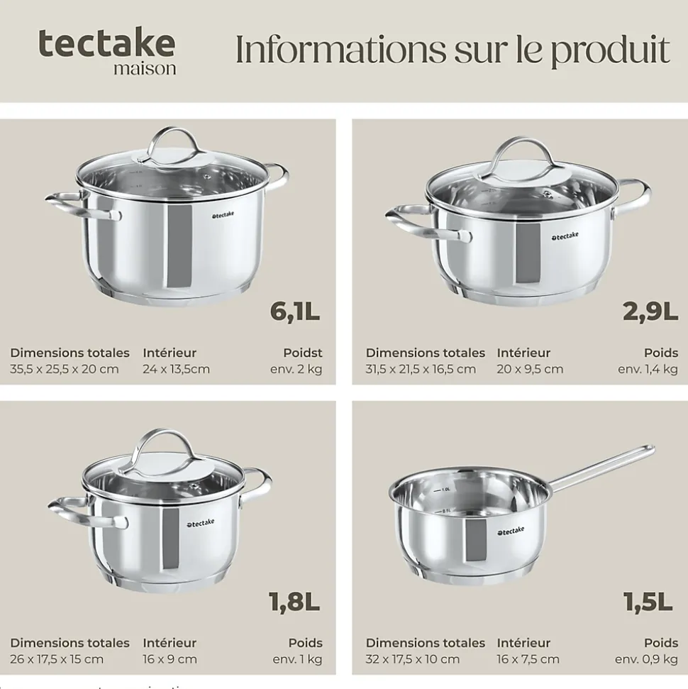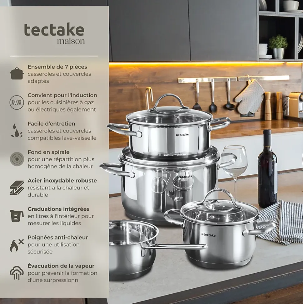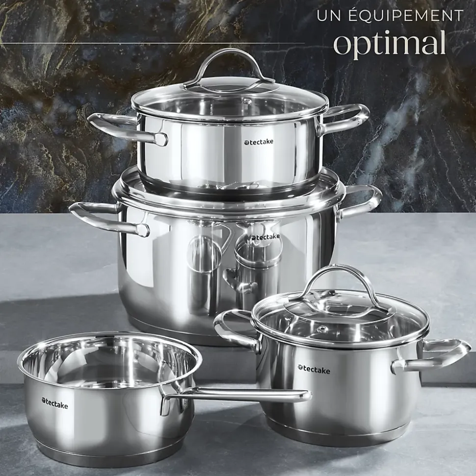 Parfait pour la cuisine moderneL’ensemble de casseroles Bologne de tectake est le choix idéal pour tous ceux qui attachent de l’importance à la polyvalence et à la qualité. L’ensemble comprend trois casseroles de tailles différentes avec leurs couvercles assortis ainsi qu’une casserole pratique. Que ce soit pour l’induction, le gaz ou l’électricité – l’ensemble de casseroles Bologone est adapté à tous les types de cuisinières et offre ainsi une flexibilité maximale.Fabrication de haute qualitéFabriqué en acier inoxydable robuste, cet ensemble de casseroles est synonyme de durabilité et de facilité d’entretien. Les casseroles sont non seulement compatibles avec le lave-vaisselle, mais aussi particulièrement résistantes aux rayures et absolument inoxydables. Grâce aux fonds en spirale, la chaleur est également répartie ce qui rend la cuisson plus efficace et permet d’économiser de l’énergie.Contenances convivialesUn autre atout de l’ensemble de casseroles Bologone est l’échelle de mesure pratique en litres à l’intérieur des casseroles. Vous pouvez ainsi quantifier les liquides directement dans la casserole, sans avoir besoin d’un verre doseur supplémentaire. Les couvercles en verre vous permettent de surveiller le processus de cuisson à tout moment, tandis que la sortie à vapeur intégrée garantit qu’aucune surpression ne se produise.Une utilisation agréableL’ensemble de batterie de cuisine séduit également par sa facilité de manipulation car les poignées robustes et résistantes à la chaleur tiennent bien en main et offrent une prise en main sûre. Surtout lors de la cuisson avec des liquides chauds, une poignée stable est un avantage décisif pour éviter les accidents dans la cuisine.Que ce soit pour vos repas quotidiens, pour des occasions spéciales ou pour une collation rapide entre les deux – l’ensemble de casseroles à induction Bologne de tectake rend la cuisine polyvalente facile.