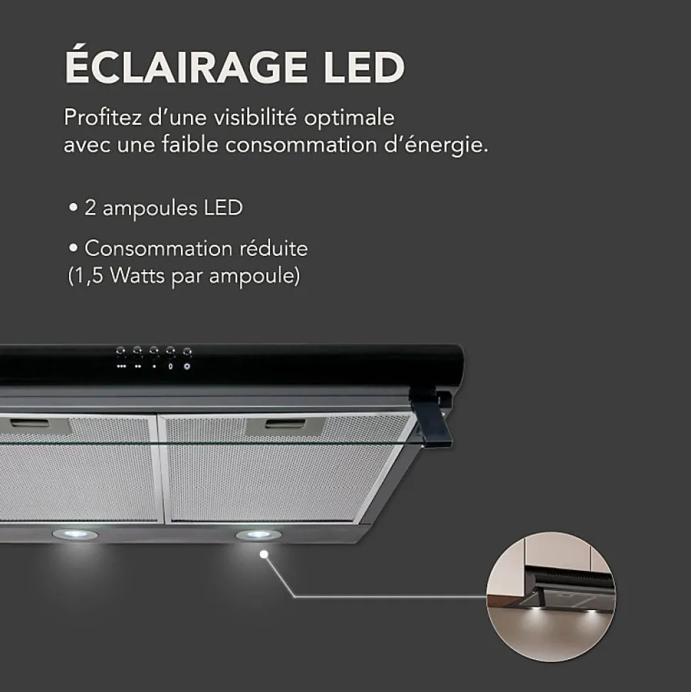 Discrète et pratique, cette hotte s’installe sous un meuble de cuisine ou directement au mur.