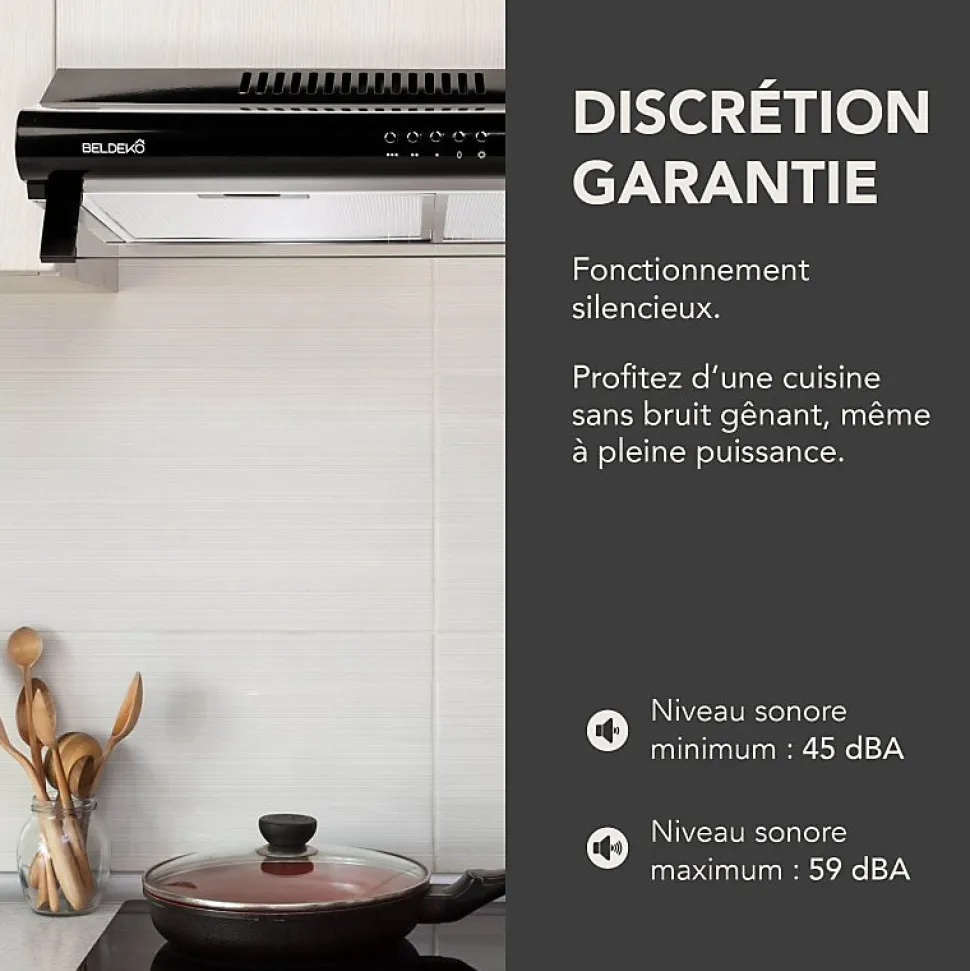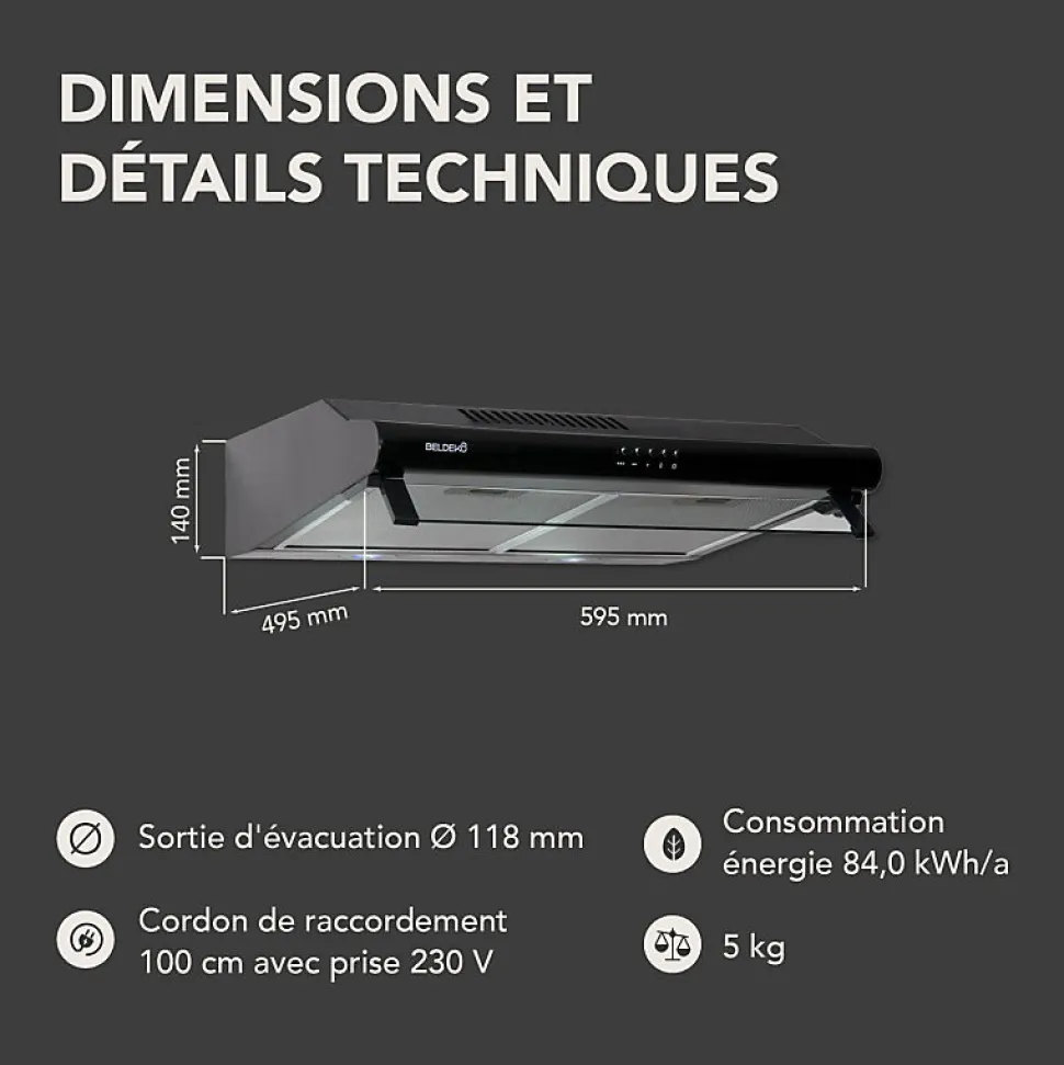 Hotte casquette GRETA 60 BK – Marque BELDEKO – Coloris noir – Matière : acier peint et verre