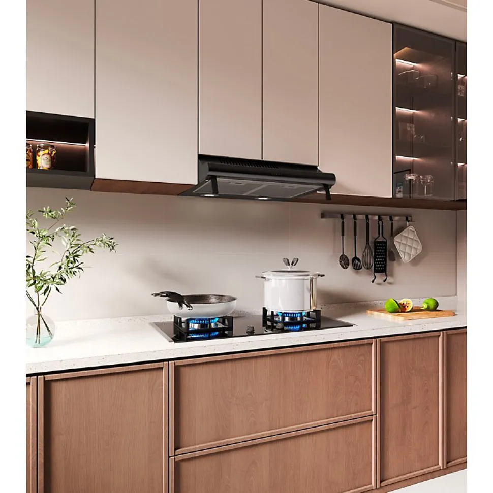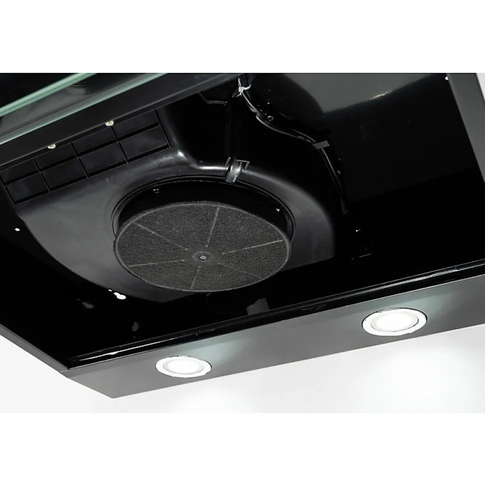 Hotte casquette NOIR 60 cm, moteur de 100W, capacité d’extraction de 240 m³/h, compatible avec l’évacuation extérieure et le recyclage, livrée avec deux filtres à charbon pour un air toujours pur.