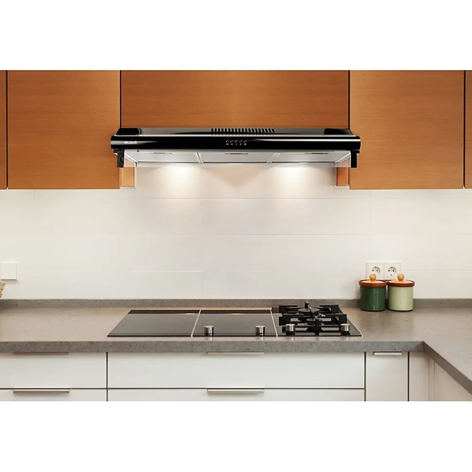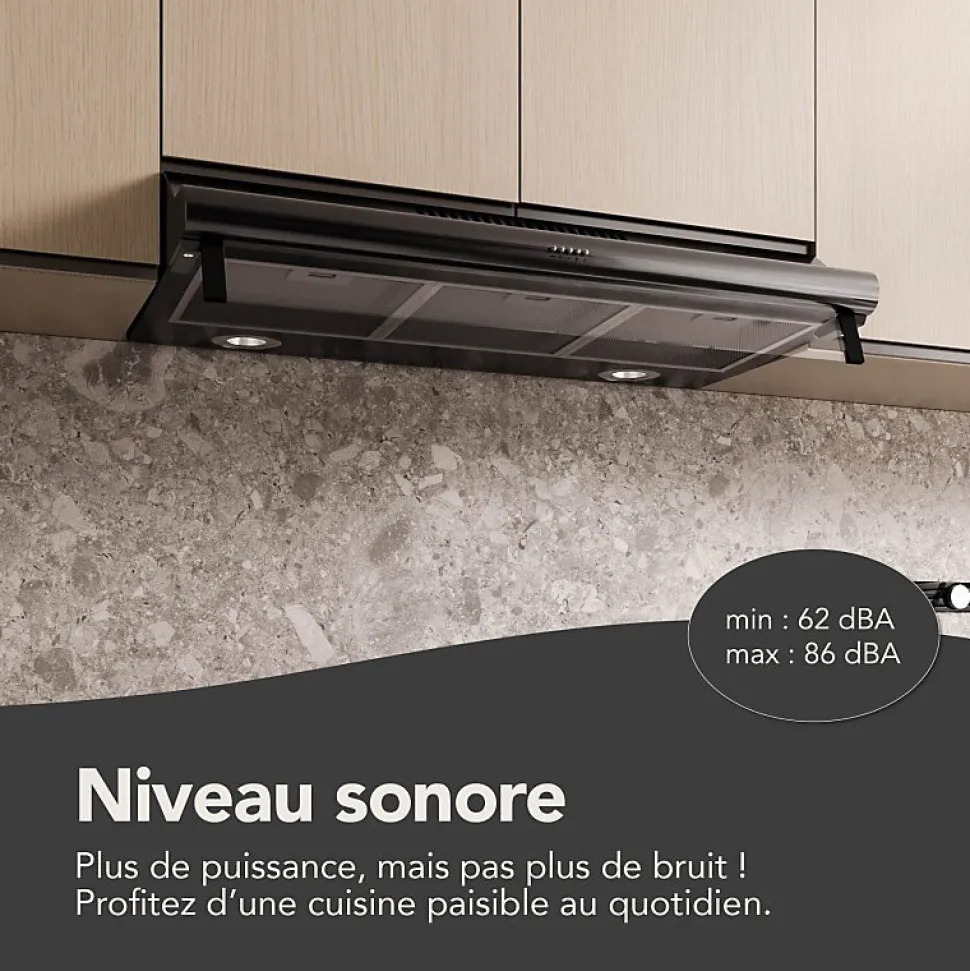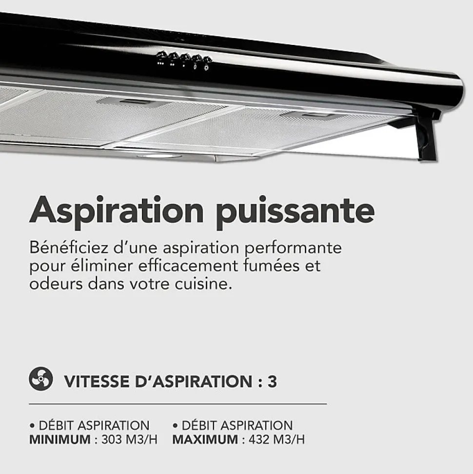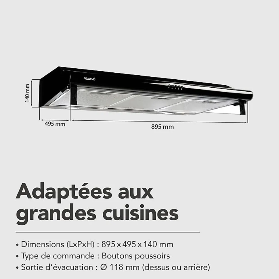Hotte casquette NOIR 90 cm, double moteur de 200W, capacité d’extraction de 420 m³/h, fonctionnant en évacuation extérieure ou recyclage, idéale pour une cuisine efficace et moderne.