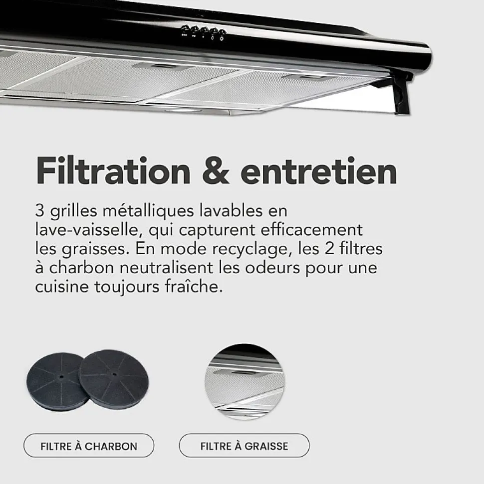 - Hotte à évacuation ou recyclage livrée avec filtre à charbon, Filtres à graisse : grilles lavables en lave-vaisselle, Commandes par boutons poussoirs, Clapet anti-retour.