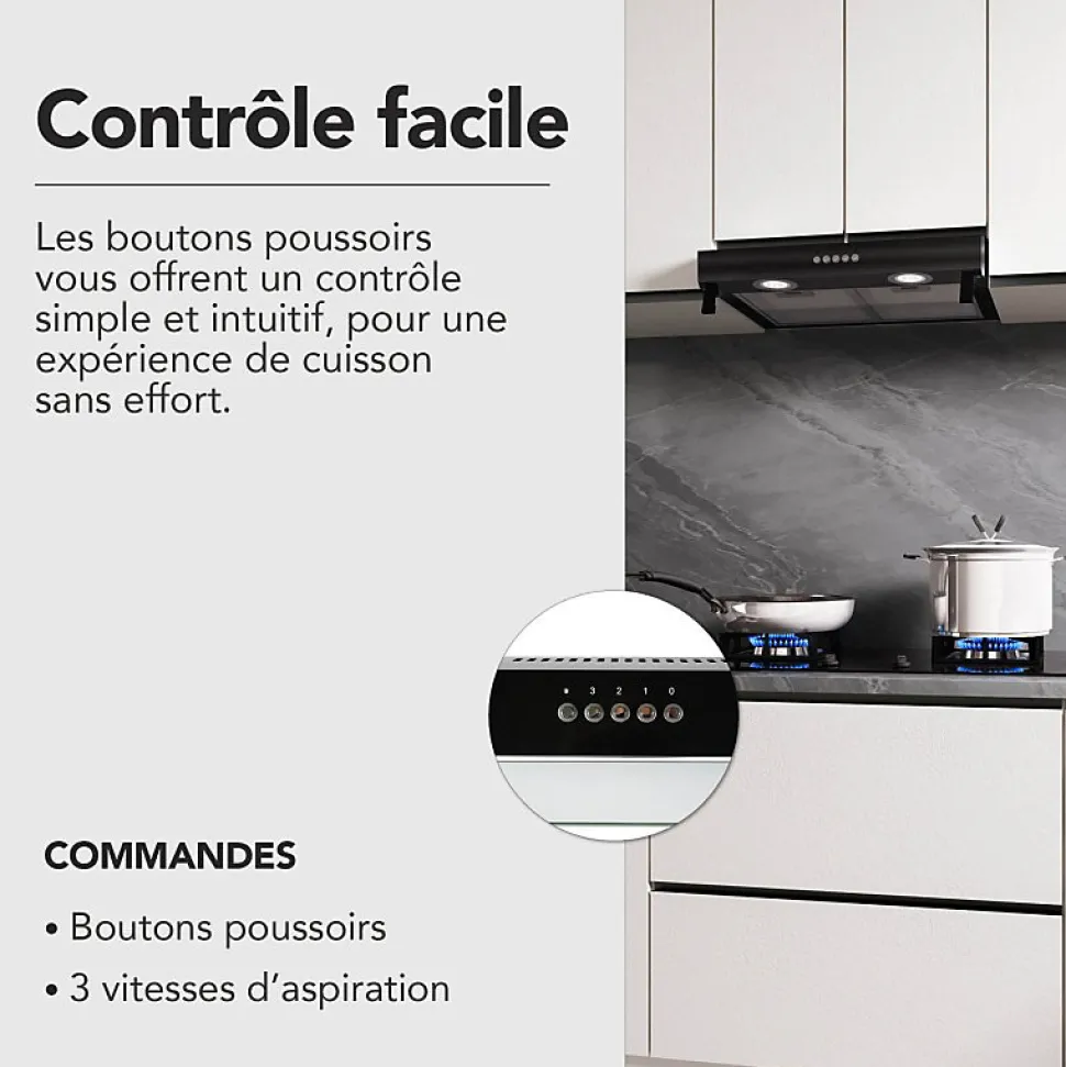 - Hotte à évacuation ou recyclage livrée avec filtre à charbon, filtres à graisse lavables en lave-vaisselle et clapet anti-retour. Commandes par boutons poussoirs.