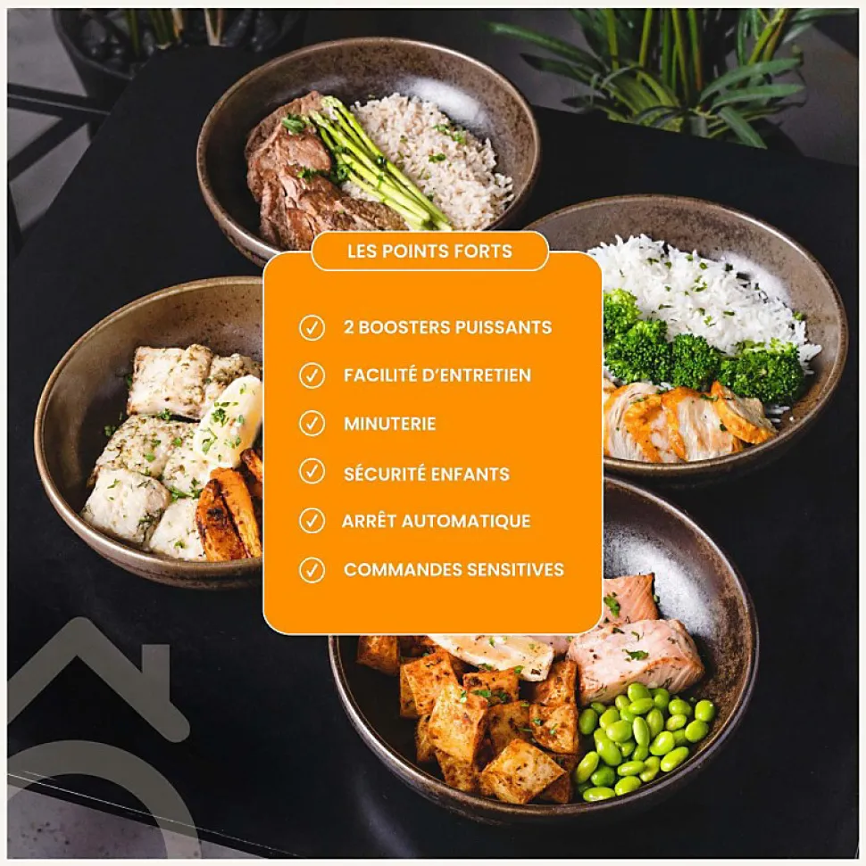 Avec 3600 W de puissance et 2 foyers avec boosters, cette plaque assure une montée en température rapide et une cuisson précise. Idéale pour allier rapidité, efficacité et praticité au quotidien.