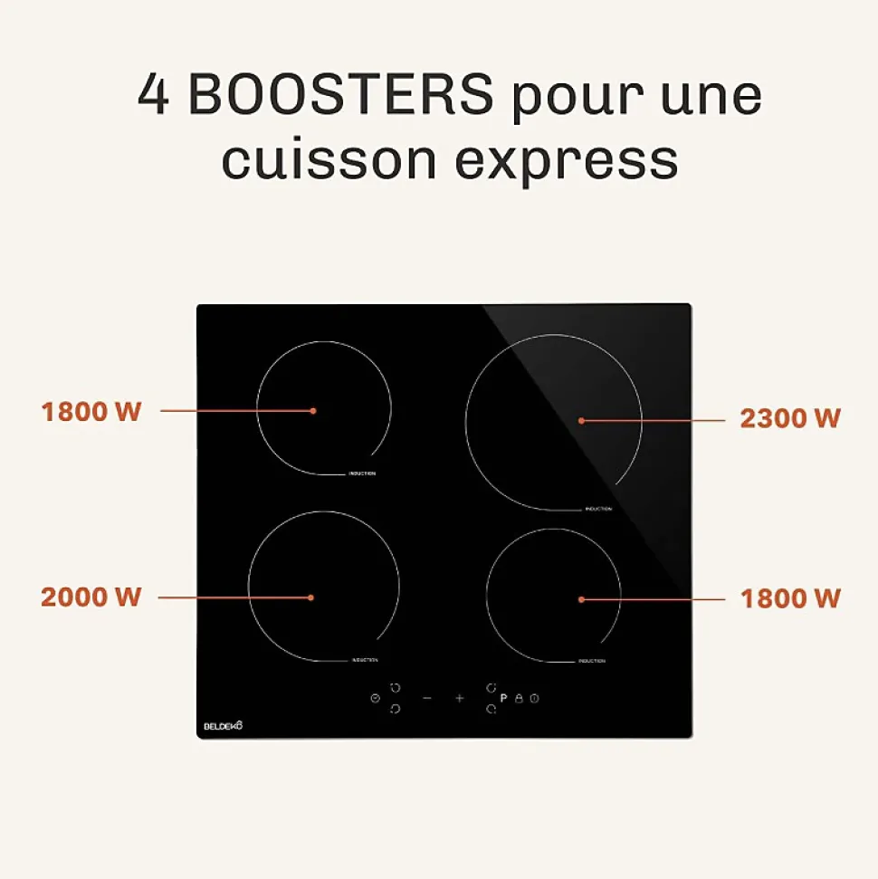 - « Les plus » : Minuterie individuelle / Voyants de chaleur résiduelle / Verrouillage enfant / Arrêt automatique 120 minutes / 4 Boosters / Plaque compatible pour installation électrique 32 Ampères grâce à sa gestion de puissance limitée à 6700 Watts