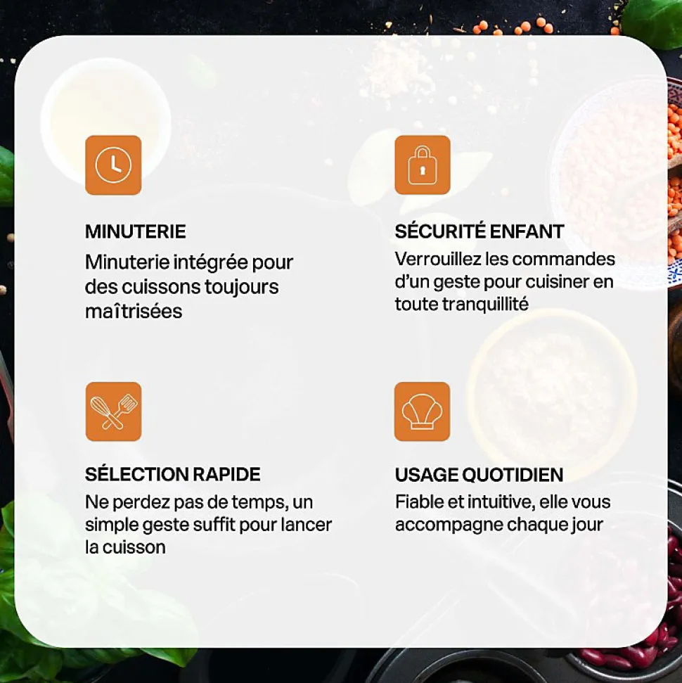 - La fonction « degrés » permet de sélectionner une température de cuisson comprise entre 60°C et 240C°. Dotée d’une minuterie (240 min) avec arrêt automatique pour une cuisson toujours parfaite !