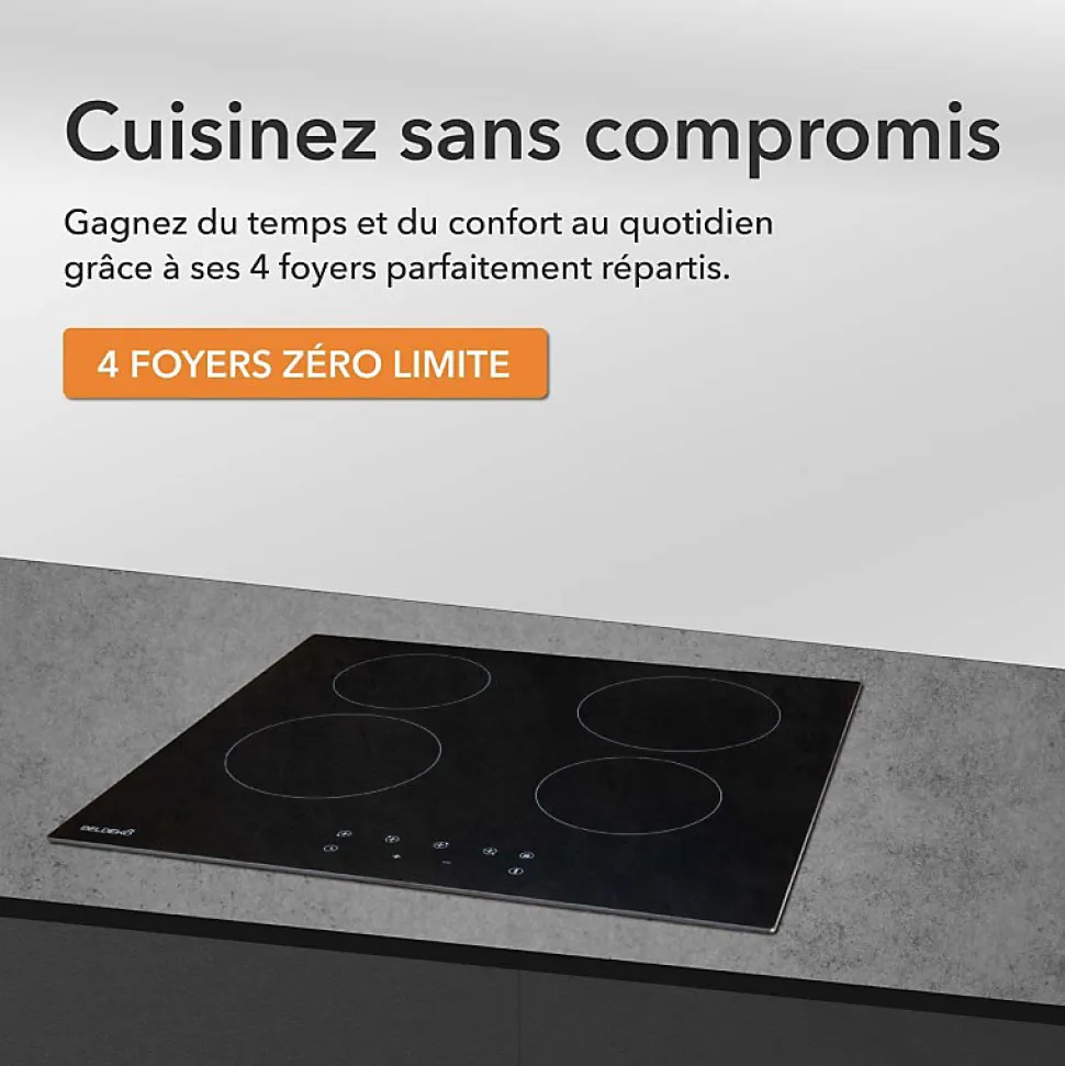 Plaque de cuisson vitrocéramique 4 foyers, 6000W, contrôle précis de la température, idéale pour une cuisine moderne et performante avec une répartition homogène de la chaleur.