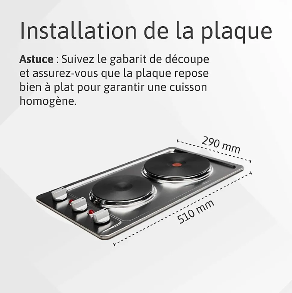 Plaque encastrable 2 foyers, idéale petits espaces : kitchenette, cuisine d’appoint, résidence secondaire, cuisine extérieure ou van. Compacte et pratique, elle s’adapte partout.