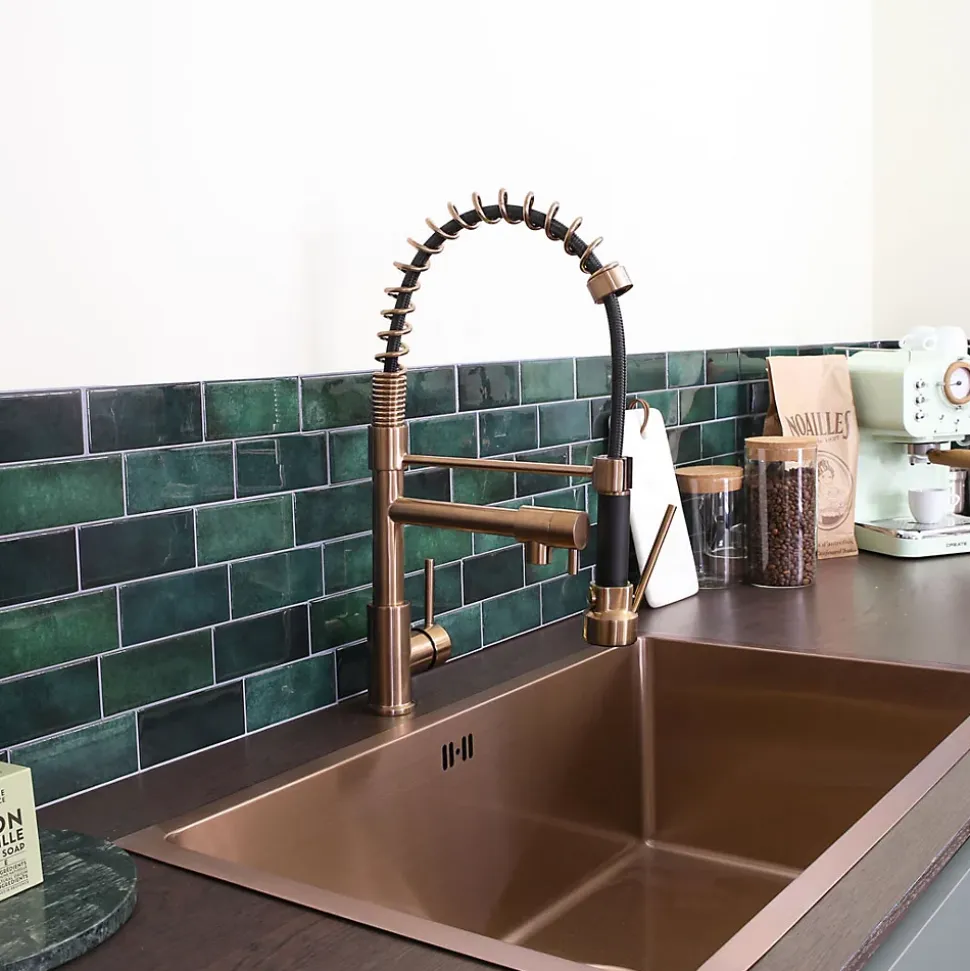 Le ‘Big Pro’ est le mitigeur par excellence. Design moderne et industriel, pratique et complet en version cuivre brossé, doté d’un bec verseur, il sera très utile dans votre cuisine. DESIGN ET QUALITE – Couleur : Cuivre brossé – Produit : Robinet mitigeur évier à douchette mobile (non extractible) – Corps du robinet : Rond en laiton avec barre stabilisatrice de maintien – Bec : Pivotant et bec verseur avec robinet d’arrêt – Barre stabilisatrice de maintien : En laiton – Poignée : En métal – Douchette : Mobile avec monojet – Aérateur anticalcaire : Oui (limite la production de calcaire) – Mécanisme : Cartouche à disques céramique 35 mm – Flexible : Ressort en métal avec flexible tressé – Kit de fixation : Système ESSEFIX (fixation facile sans outil) – Alimentation à l’eau : Lyres tressées inox 35 cm incluses DIMENSIONS – Hauteur totale : 483mm – Hauteur sous bec : 95mm – Largeur sortie d’eau/axe du corps : 222mm – Diamètre embase : 50mm NORMES : – Certification ACS : Accréditation de Conformité Sanitaire. GARANTIE : – Corps garanti 5 ans. – Pièces d’usure (poignée, cartouche, flexibles…) garanties 2 ans. Conseils d’utilisations et d’installation : – Avant de procéder au montage, nous vous conseillons de purger soigneusement les tuyauteries d’eau chaude et d’eau froide pour éviter que les saletés et résidus puissent compromettre le bon fonctionnement de la robinetterie. – Après avoir fermé l’alimentation d’eau principale, démonter l’ancienne robinetterie. – Nettoyez soigneusement le filetage des tubes d’alimentation d’eau principale. – Installer le mitigeur de cuisine dans un trou de 35 mm dans un évier ou plan de travail. – Vérifiez que la longueur du bec est compatible avec votre évier (voir dessin technique) Conseils d’entretien : – Pour garder votre robinet le plus longtemps possible, l’idéal est de le nettoyer tous les jours avec un chiffon humide non abrasif ou une microfibre, terminer en essuyant avec une microfibre ou un chiffon sec. – Ne jamais utiliser de
