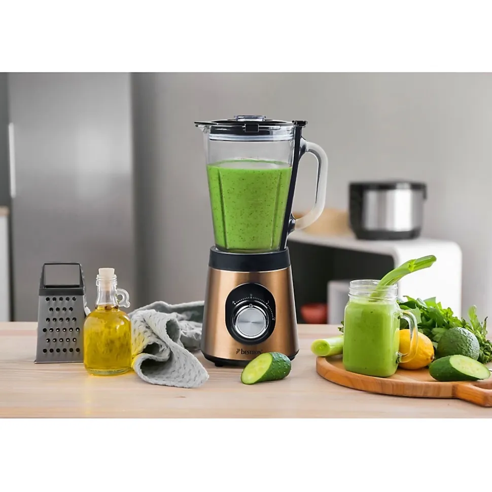Blender 1.5l 500w cuivre Bestron – Le blender ABL500CO de Bestron dispose d’un design élégant cuivré. – BlenderCapacité : 1.5 LBol en verre amovible, compatible lave-vaisselleCouvercle de sécurité marche/arrêtOrifice de remplissage pratique2 vitesses + position pulse4 lames en inox amovibles, aussi pour glace piléeFacile à nettoyerPieds antidérapantsDimensions : 15,5 x 17 x 39 cmPoids : 2.85 kgCouleur : cuivre