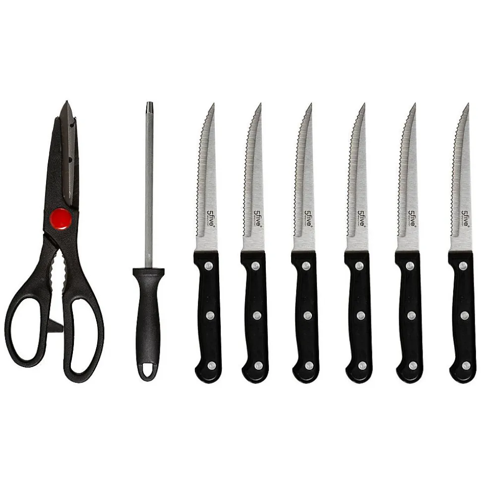 - Contient : 1 aiguiseur, 1 paire de ciseau, 6 x Couteaux à Steak, 1 x Couteau chef, 1 x Couteau à pain, 1 x Couteau à trancher, 1x Couteau utilitaire, 1 x Couteau d’office.