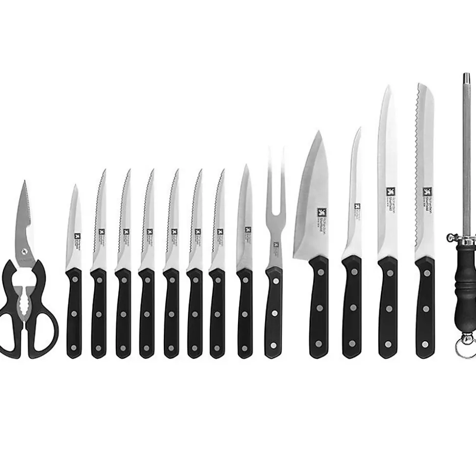 - 1 bloc, 1 couteau d’office, 1 couteau utile, 1 couteau de cuisine, 1 couteau à découper, 1 couteau à pain, 1 couteau à désosser, 1 fourchette à découper, 1 coupe-volaille, 1 aiguiseur, 6 couteaux steak