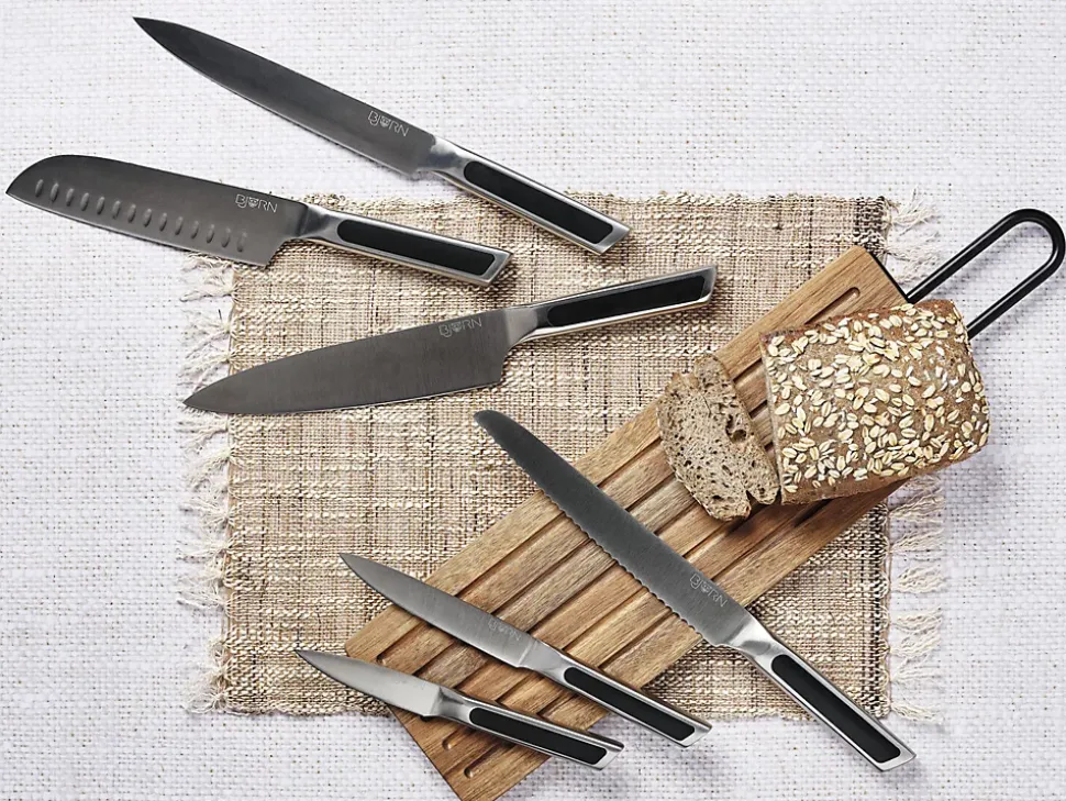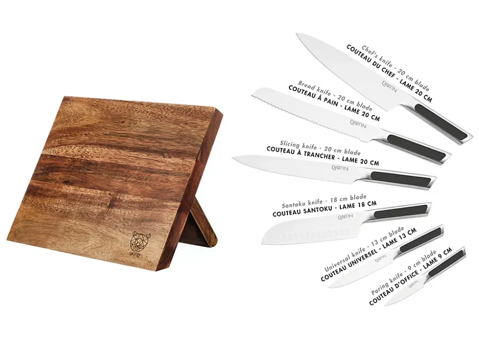 Faire le choix du bloc couteau VANTAA c’est opter pour le côté pratique & chic. Confectionné avec soin en bois d’acacia verni, il présente une apparence design et minimaliste. Il comporte de puissants aimants intégrés, créant une surface entièrement magnétique qui maintient solidement vos couteaux en place. Le support pliable à l’arrière offre une stabilité pendant l’utilisation et se replie facilement pour un rangement compact. Cette fonctionnalité vous permet de ranger facilement le bloc lorsqu’il n’est pas utilisé tout en conservant un maintien des couteaux. Le bloc magnétique VANTAA représente non seulement une solution de rangement ingénieuse, mais aussi un élément de décoration original dans le séjour ou la cuisine.Les couteaux LOKI allient fonctionnalité, durabilité et design et ont été spécialement conçus pour répondre aux besoins de tous. La combinaison des couleurs noire et métal confère à ces couteaux un aspect très chic et moderne tandis que la finition satinée des lames exprime toute la qualité d’une découpe lisse et précise. Particulièrement aiguisées, ces lames offrent une performance de coupe optimale pour émincer, trancher ou hacher. Ils sont fabriqués en acier inoxydable de haute qualité pour garantir une longue durée de vie et passer au lave-vaisselle. Les poignées des couteaux quant à elles sont à la fois résistantes et antidérapantes, permettant d’accomplir toutes vos taches culinaires avec succès. Le set rassemble les indispensables de la découpe pour réussir toutes vos préparations : le couteau d’office pour couper et peler, le couteau universel est très polyvalent, le couteau santoku pour les herbes aromatiques, les fruits et les légumes (les aliments ne restent pas collés à la lame grâce aux alvéoles), le couteau à trancher pour couper les viandes sans les déchirer, le couteau à pain permet de découper des tranches nettes sans en abîmer la croûte et le couteau du chef pour les fruits, légumes, viandes ou poissons…