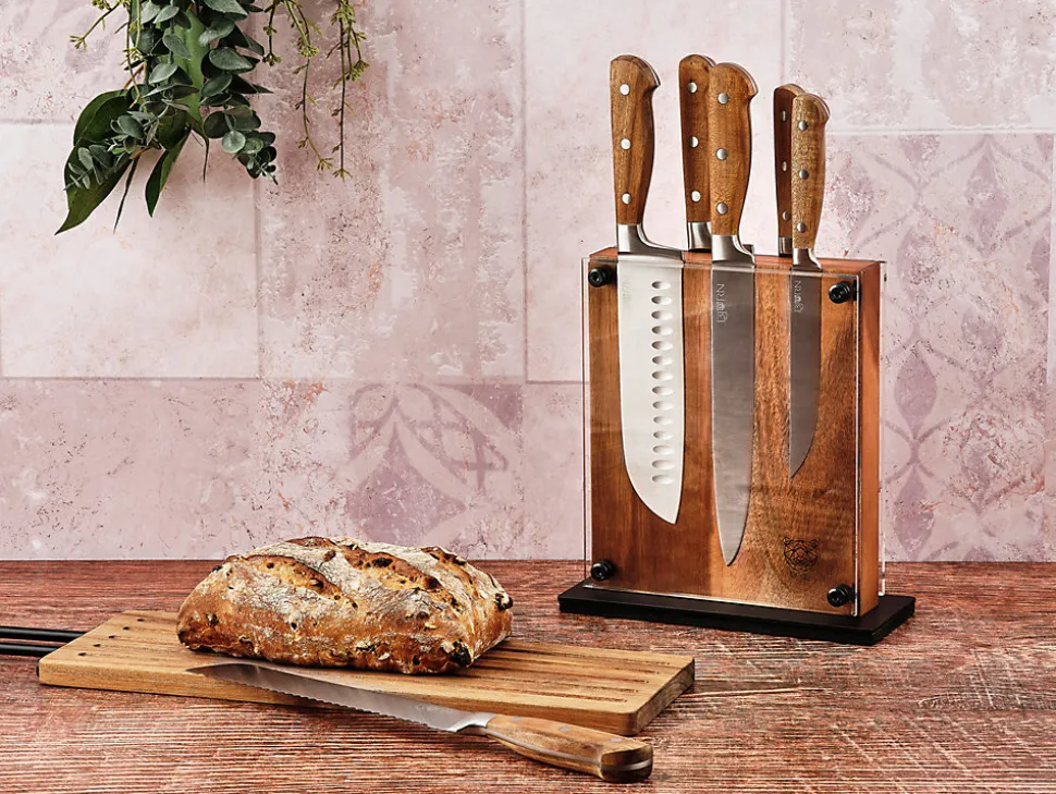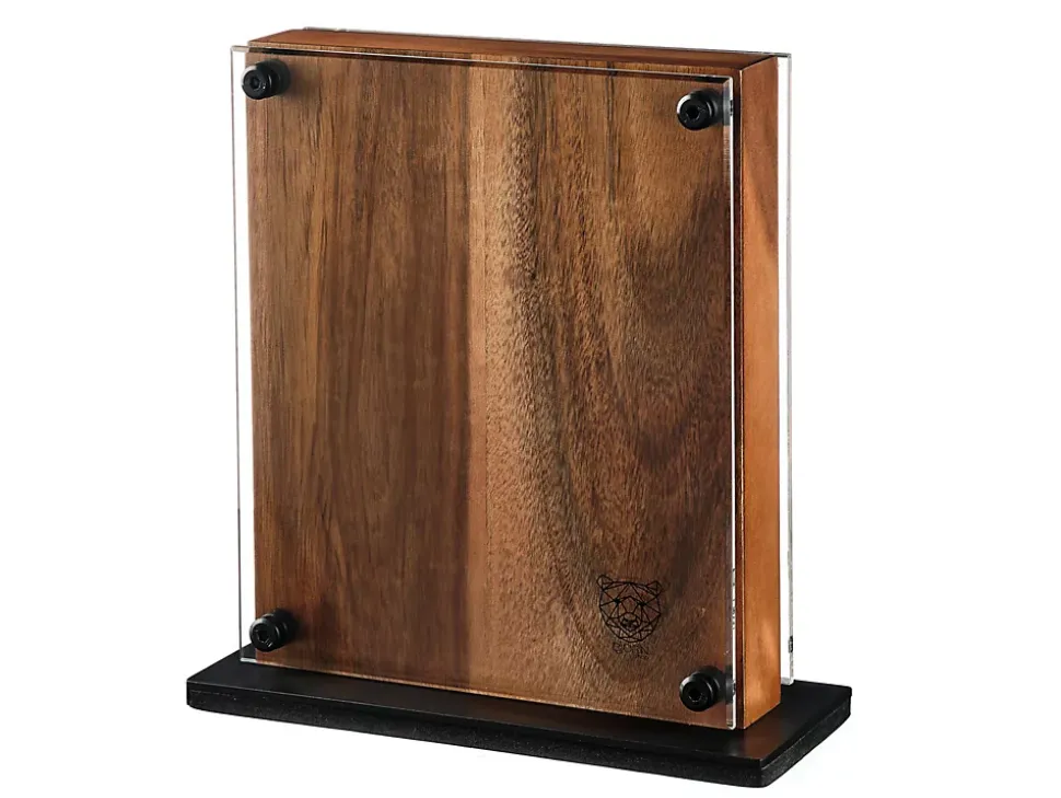 Bien plus qu’un simple accessoire pour ranger vos couteaux sans les abîmer, RAUMA deviendra une véritable pièce maîtresse dans votre cuisine. Le bloc couteaux magnétique propose une façon moderne et esthétique d’afficher vos nouvelles lames, tout en permettant un accès et un stockage faciles de vos couteaux. Avec son design épuré et naturel, le grain unique et la couleur riche du bois d’acacia apportent une touche authentique à votre cuisine. Grâce au système de fixation magnétique puissant, vos couteaux resteront solidement en place, offrant une organisation pratique tout en affichant ces éléments design dans la cuisine. Vous pourrez ainsi les admirer comme de véritables œuvres d’art à travers la vitre de protection transparente (et amovible) du bloc.