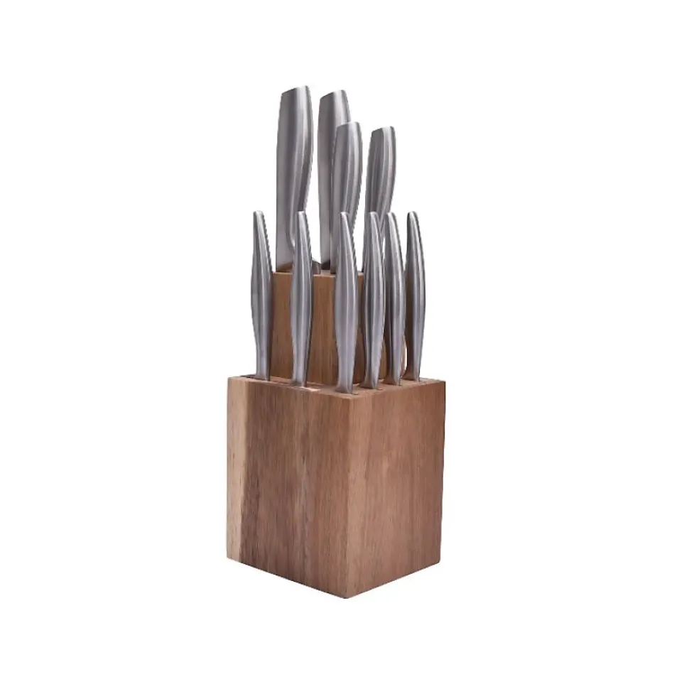 Bloc de 10 couteaux inox Jean Dubost – Le bloc 10 couteaux Fusal DF13A0X0X0125 de Jean Dubost est pratique et fonctionnel, ce bloc réunit 10 couteaux : 4 couteaux de cuisine indispensables (couteau Office 9 cm, couteau Chef 20 cm, couteau à Pain 20 cm et couteau Santoku 18 cm) ainsi que 6 couteaux à steak ! – Bloc 2 en 1 emboîtable en bois d’acacia. – Type de produit : Bloc de couteaux.Diamètre : 9/18/20 cm.Nettoyage facile.Matière : Inox.