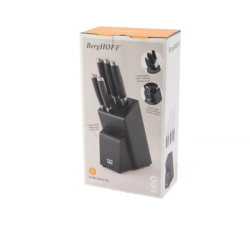 Bloc de 5 couteaux lames inox Berghoff – Vous souhaitez élargir votre collection de couteaux avec des couteaux de haute qualité au design épuré et un bloc de couteaux assorti ? Ce bloc à 5 couteaux contient des couteaux en acier chromé de haute qualité : couteau d’office, couteau utilitaire, couteau à découper, couteau à pain et couteau de chef. Dans le magnifique bloc à couteaux en bois d’hévéa noir, vous pouvez ranger tous ces couteaux de façon pratique et à portée de main pour la préparation de vos aliments. Pour que cet ensemble soit complet, nous avons prévu un espace de rangement pour le Couteau santoku et les ciseaux à volaille assortis. – Poignée ergonomique pour un contrôle optimalBase antidérapante pour plus de stabilitéUn couteau pour chaque tâche de coupeGarde vos couteaux organisés en toute sécurité et prêts à l’emploiAcier inoxydable de haute qualitéFacile à nettoyer1 x chef knife – 20,00 cm1 x bread knife – 20,00 cm1 x carving knife – 20,00 cm1 x utility knife – 12,00 cm1 x paring knife – 9,00 cm1 x knife block 23,50 x 15,00 x 10,00 cmFinition extérieure : BoisMatière du produit : Bois de caoutchoucMatière de la poignée : ABS et acier inoxydableEntretien : Lavage main recommandéAntiadhérent : NonSérie : GraphiteCollection : LeoPoids net du produit (kg) : 2.21Dimensions extérieures du produit (cm) : 17 x 9 x 22
