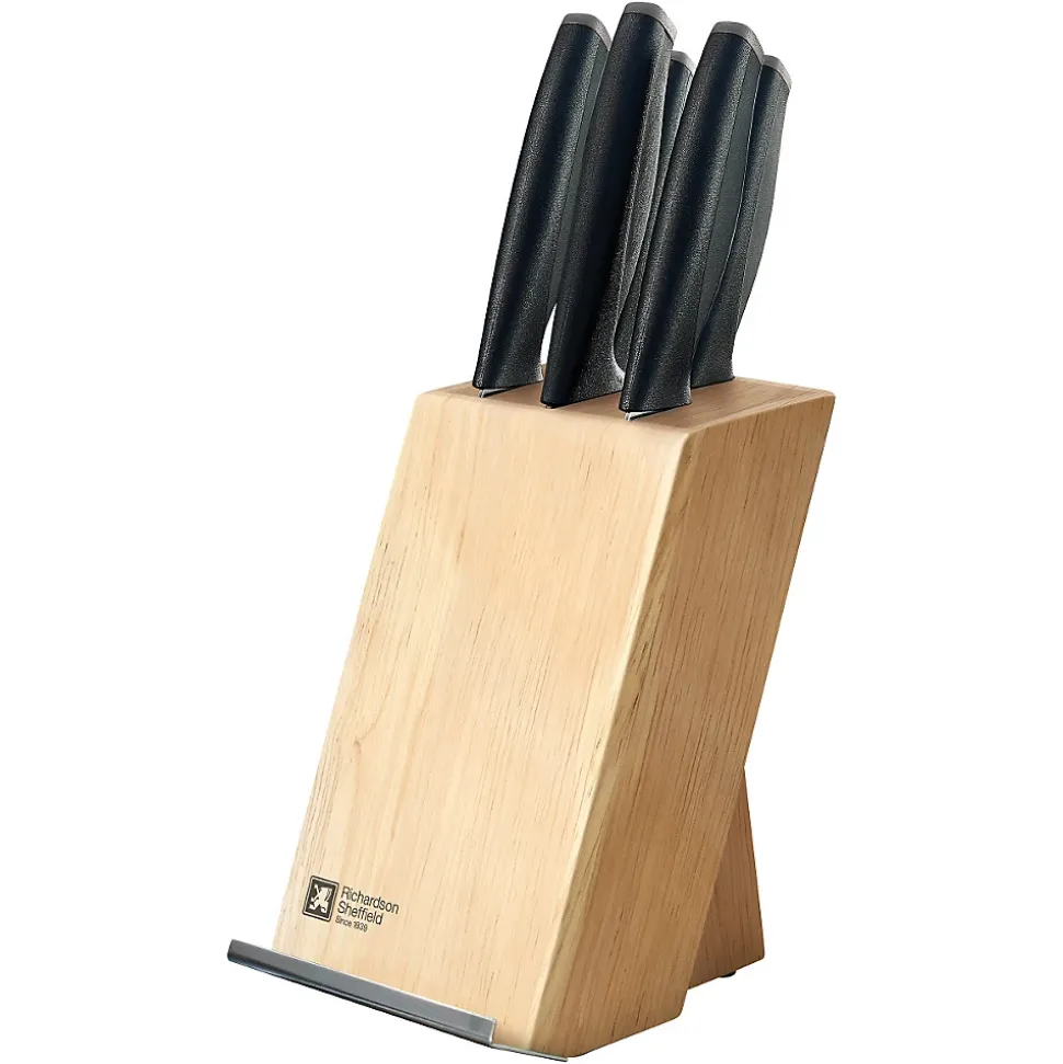 Bloc de 5 couteaux de cuisine office, utile, chef, découper et pain. Acier inoxydable 13/0 et finition satinée. Astucieux, le bloc sert de support à votre iPad ou à un livre de recettes. Avec sa ligne fuselée, la collection Advantage de Richardson Sheffield apporte une touche de modernité à votre cuisine. Les manches ont une finition anti-dérapante soft touch qui garantit le meilleur confort d’utilisation. Expert coutelier depuis 1839, Richardson Sheffield s’est forgé une réputation sans précédent, en devenant l’un des leaders de la coutellerie au Royaume-Uni. Les couteaux permettent de satisfaire les passionnés d’arts culinaires, professionnels ou amateurs Dimensions Couteau chef : 33cm, lame 19cm ; Couteau à découper : 32.5cm, lame 19.5cm ; Couteau pain : 32.5cm, lame 19.5cm ; Couteau utile : 23.5cm, lame 12cm ; Couteau d’office : 20cm, lame 8cm