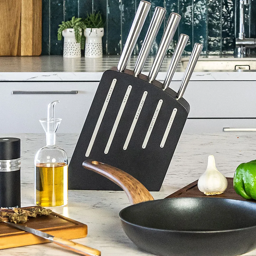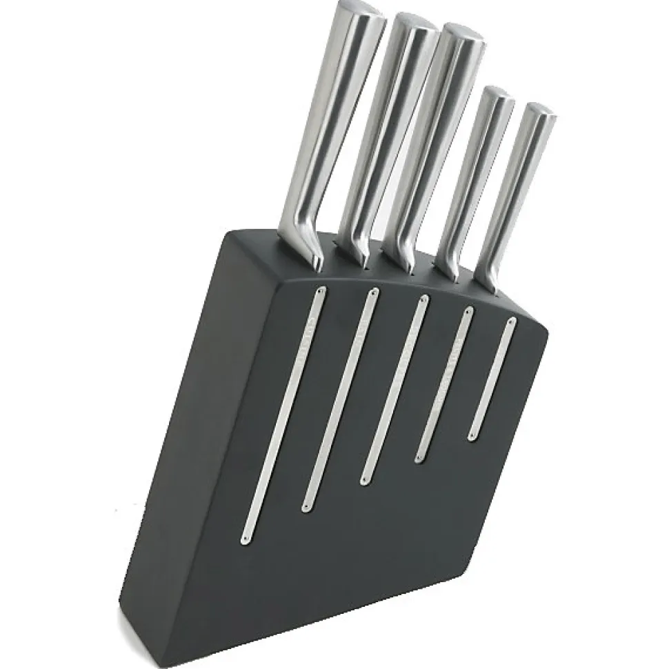 Ensemble Jean Dubost Kimono 5 pièces en acier inox satiné — couteau de chef, couteau à pain, couteau à découper, couteau utility et couteau d’office — présenté dans un élégant bloc en bois teinté noir avec inserts métalliques. Lames fines et résistantes (8,5–21 cm) et manches polis en inox pour un design moderne et minimaliste; bloc conçu pour se tenir verticalement et protéger les lames.