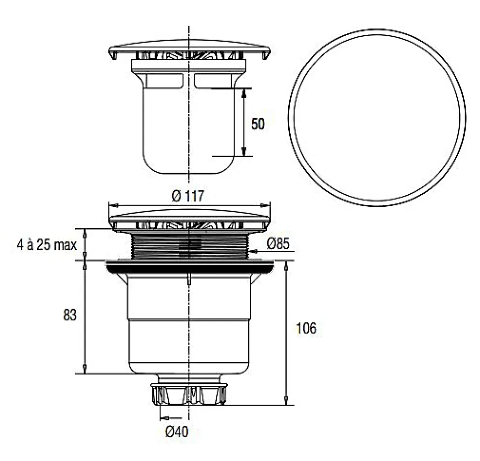 La bonde de douche de Valentin avec capot chromé allie praticité et esthétique dans une salle de bain. Elle permet un nettoyage simple sans outil et offre un accès direct à la canalisation pour faciliter la maintenance.Fabriquée en plastique robuste avec une finition chromée, elle s’adapte à différentes épaisseurs de receveur grâce à un serrage ajustable. Sa conception assure un écoulement fluide de l’eau et prévient la formation d’obstructions pour un fonctionnement régulier. Caractéristiques techniques :Cuvette et clapet inoxType de pose : sur baignoireSortie à visser diamètre 40 mmLongueur du câble : 500 mmEncombrement : 132 mm