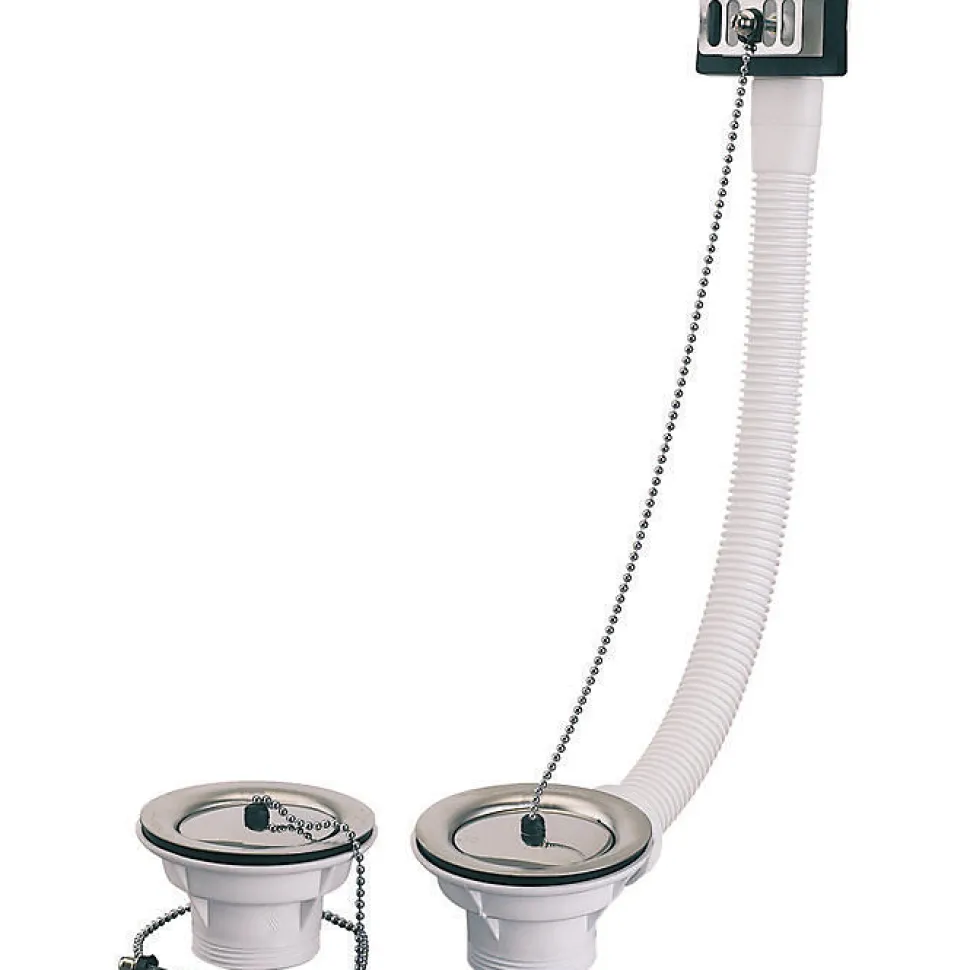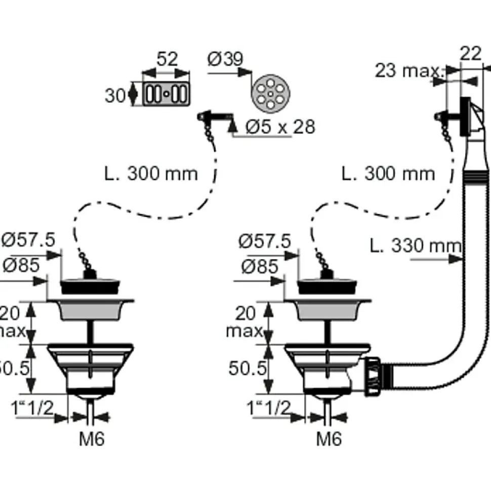 Bondes évier 2 cuves diam. 60 mm à bouchon avec enjoliveur inox diam. 57,5 mmCuvettes inox diam. 85 mmSerrage 0 à 20 mmVis inox M6 x 40Débit : 55 l/mnH. sous évier 50,5 mmGrilles de trop-plein rectangulaire et rondeFlexible recoupable