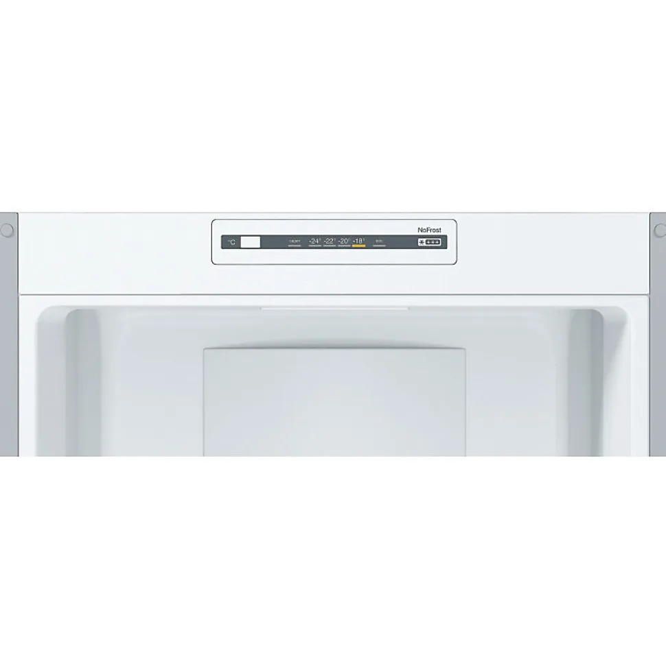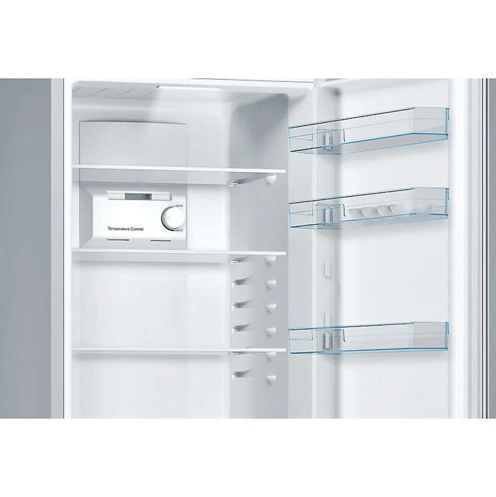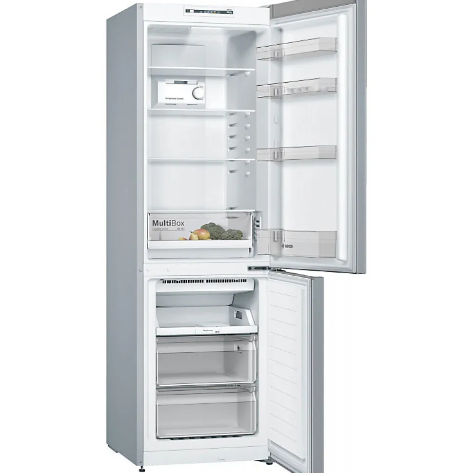 Le réfrigérateur combiné Bosch KGN 36 NL EA est un appareil No Frost équipé du système MultiAirflow pour une conservation optimale des aliments, avec des étagères en verre, un éclairage LED et un compartiment congélateur spacieux.