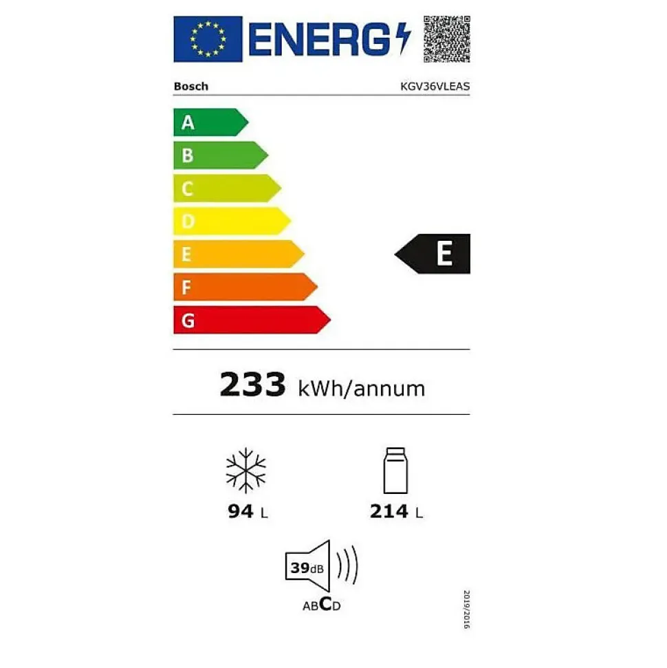 Réfrigérateur combiné Bosch KGV36VLEAS Ligne série 4 – Réfrigérateur : 214 L – Dégivrage automatique – Froid brassé Power Ventilation – Compartiment VitaFresh fruits et légumes avec contrôle d’humidité – Clayette porte-bouteilles inox – 4 clayettes verre dont 3 coulissantes EasyAccess – Eclairage LED. Congélateur : 94 L – Technologie LowFrost : décongelez moins souvent grâce à la faible quantité de formation de glace – 3 tiroirs dont 1 BigBox – VarioZone avec clayettes amovibles – Fonction Super congélation – Régulation électronique de la température avec indicateur LED – Poignées intégrées – Finition Look inox.Code EAN : 4242005197385Volume (réf.) : 214 LVolume (cong.) : 94 LType de froid : brasséNombre de compresseurs : 1Nombre de circuits : 1Régulation : électroniqueAffichage T° : ouiAlarme : nonDistributeur d’eau : sansPouvoir de congélation : 4,5 Kg/24HAutonomie : 17 heuresNiveau sonore. : 39 dB.Conso élec. : 233 kWh / anClasse climatique : SN-TConnecté : nonLABELSLabel énergie : ECatégorie sonore : CLe + produit : Régulation électroniqueDisponibilité des pièces détachées : 11 ans (donnée constructeur)Dimensions (LxHxP) : 60 x 186 x 65 cmPoids net : 73,61 KgColoris : silverPorte(s) réversible(s) : ouiLieu de fabrication : Turquie
