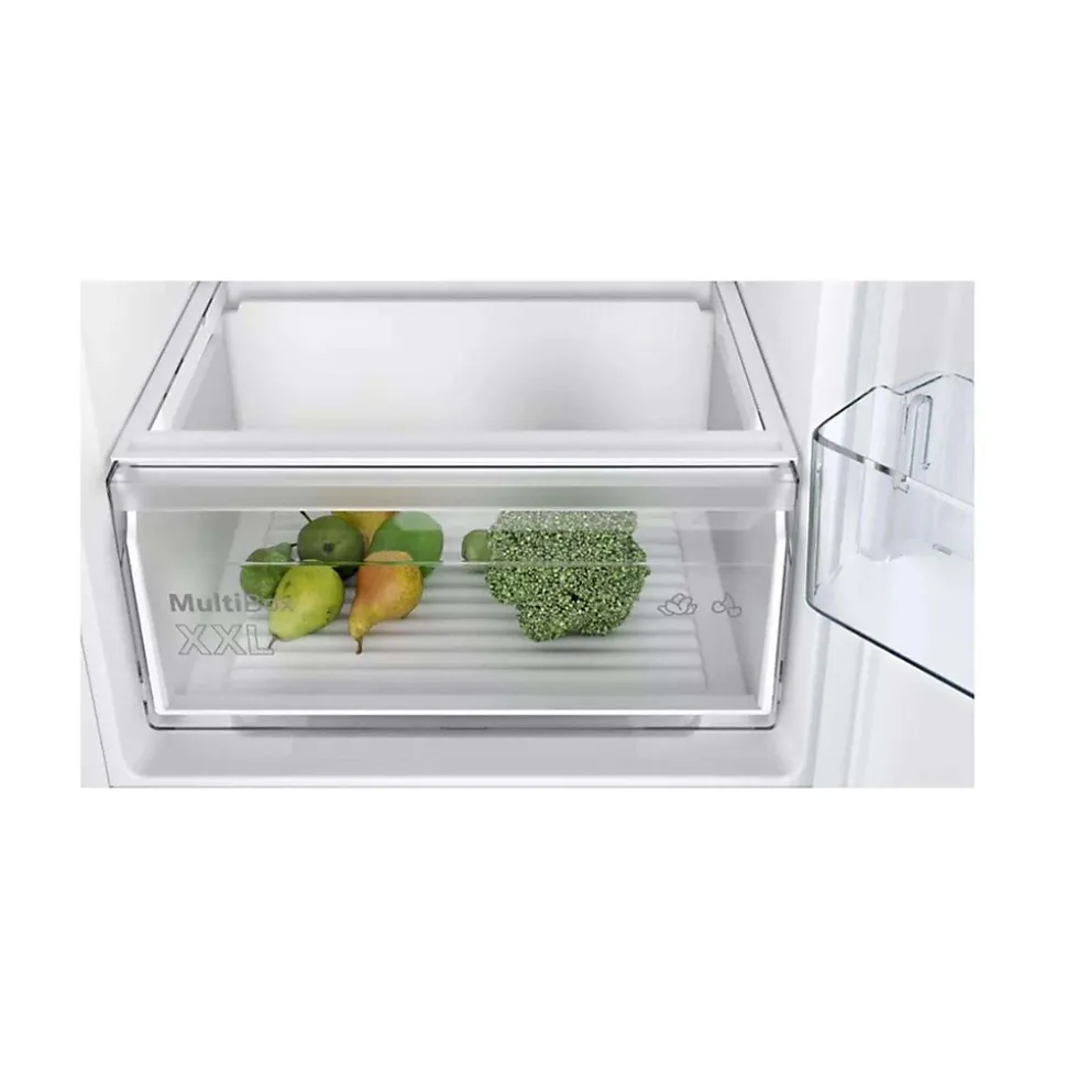 Réfrigérateur combiné intégrable, SER2, No Frost, Classe énergie E, 35 dB, Volume total : 260 l, volume réfrigérateur : 184 l, volume congélateur : 76 l, charnières à glissières, Dimensions (HxLxP) : 177,20 cm x 54,10 cm x 54,80 cm Réfrigérateur combiné intégrable Niche de 177.5 cm Volume net total 260 litres Eco Airflow Tiroir Multi Box XXL Fonctions super réfrigération et super congélation 9 h d’autonomie en cas de panne Pouvoir de congélation de 4,2 kg/24h Eclairage LED Fabrication allemande