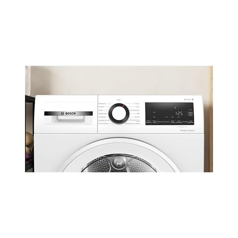 Sèche-linge pompe à chaleur Bosch Série 6 9 kg — Classe A++ — AutoDry et tambour inox SensitiveDrying pour un séchage doux. 14 programmes, filtre EasyClean, design AntiVibration et moteur à induction pour un fonctionnement silencieux (63 dB). Fin différée 24 h et nombreuses options pratiques.