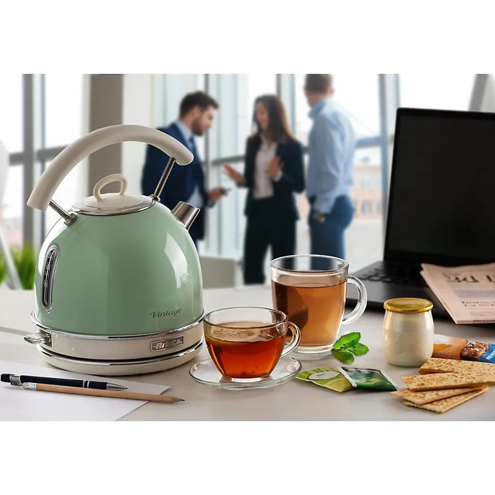 Bouilloire Électrique Vintage 1,7 Litres – Vert – Modèle 2877Le Bouilloire Électrique Vintage d’Ariete allie design rétro et performance moderne. Doté d’une capacité de 1,7 litres, d’un système d’arrêt automatique pour une sécurité renforcée et d’une poignée soft touch, il permet de chauffer rapidement de l’eau pour le thé, tisane ou tout autre usage. Idéal pour les amateurs de style vintage et de moments de détente.Caractéristiques Principales :Capacité : 1,7 litresPuissance : 2000WDesign rétro : couleurs pastel et lignes élégantesBase sans fil rotative à 360°Filtre amovible pour tisanesSystème d’arrêt automatique pour une sécurité optimaleAvantages Produit :Vous recherchez un produit qui allie style et efficacité ? Cette bouilloire offre une chauffe rapide de l’eau pour vos moments de relaxation, tout en ajoutant une touche de charme à votre cuisine. La poignée ergonomique et les parois froides garantissent une utilisation en toute sécurité.Dimensions & Poids :Dimensions : 23 x 20 x 28 cmPoids net : 1,35 kgPrêt à apporter une touche vintage à votre cuisine tout en facilitant vos préparations quotidiennes ?